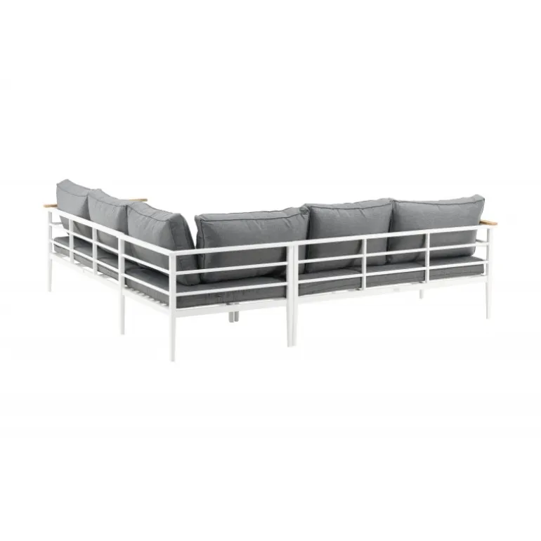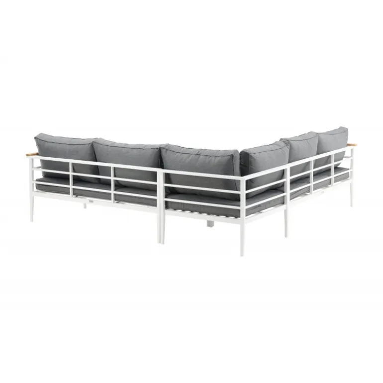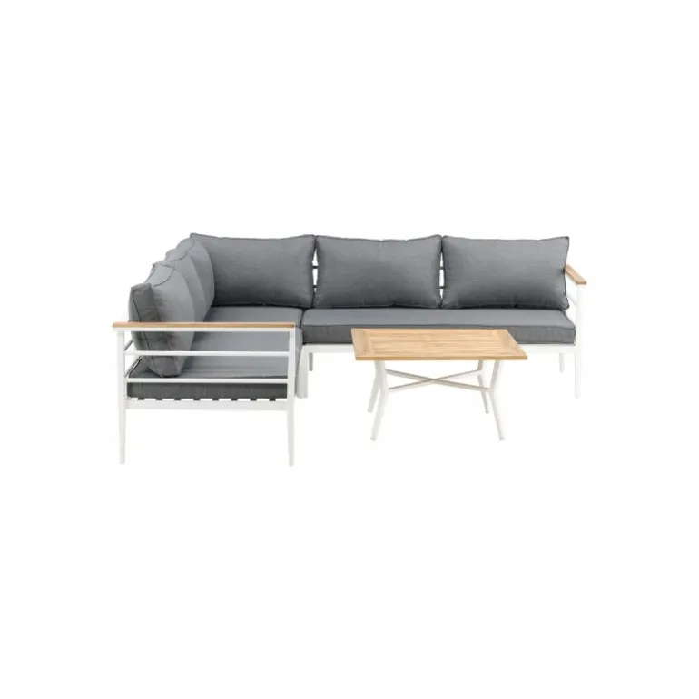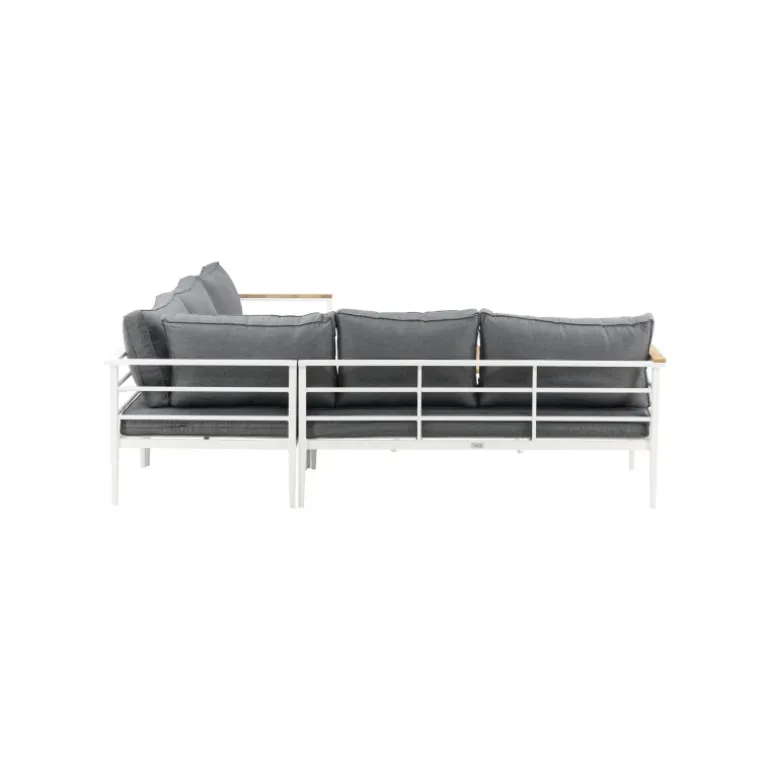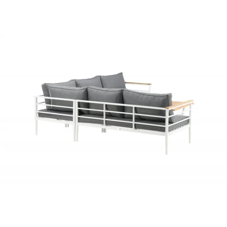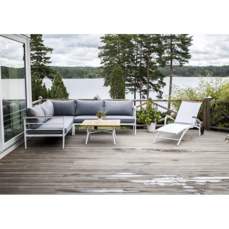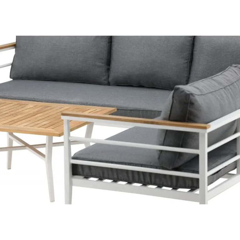 - Materialer af høj kvalitet: Hvid pulverlakeret metalramme med teakdetaljer og bløde grå puder.