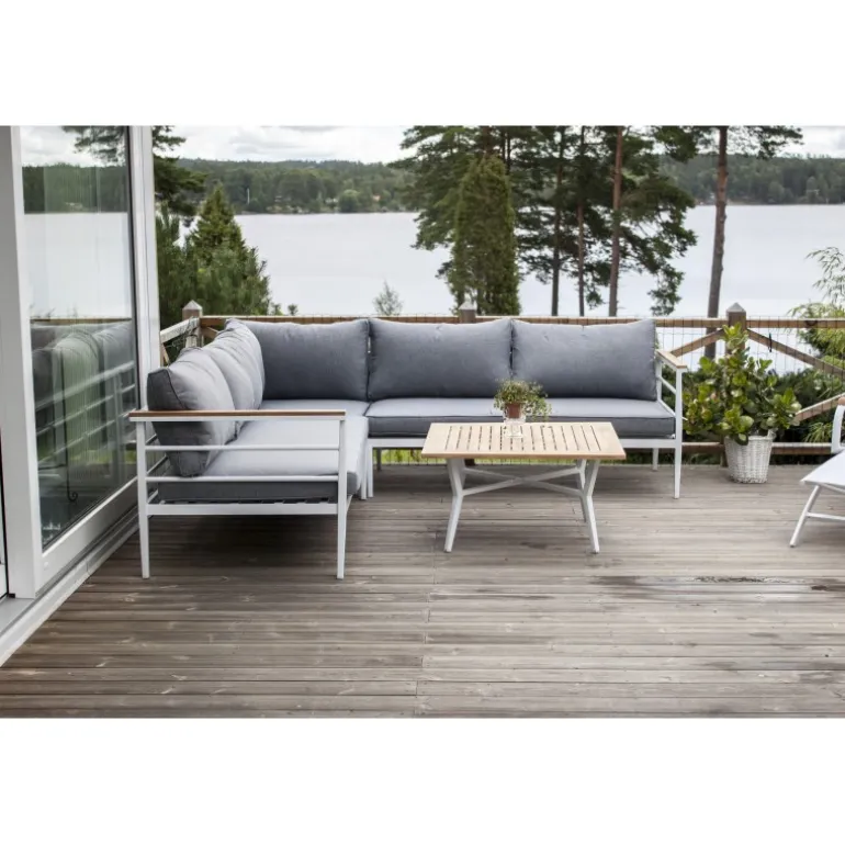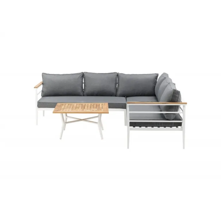 Skab et charmerende midtpunkt på terrassen til at samle dine kære denne sommer! Mexico er et smukt, matchende, moderne sofasæt med stilfuldt og iøjnefaldende design. Hjørnesofaen er fremstillet af en hvid pulverlakeret metalramme og har integrerede armlæn med lækre teakdetaljer. Bløde grå puder er inkluderet samt et lavt sofabord med en underdel i hvid pulverlakeret metal og en teak bordplade. Et sofasæt, der garanteret vil skabe succes på varme sommeraftener! Vejledning til pleje: Vores teakmøbler er produceret af certificeret teak, der er dyrket med henblik på formålet og ikke ødelagt fra sårbare regnskove. Som en af de mest holdbare træsorter indeholder teak meget olie, hvilket er nødvendigt for at materialet ikke sprækker. Fordi træsorten naturligt indeholder meget, behøver møblerne ikke at blive imprægneret så ofte.