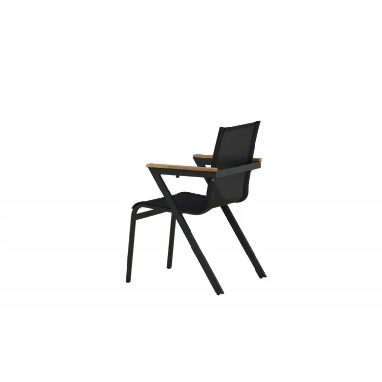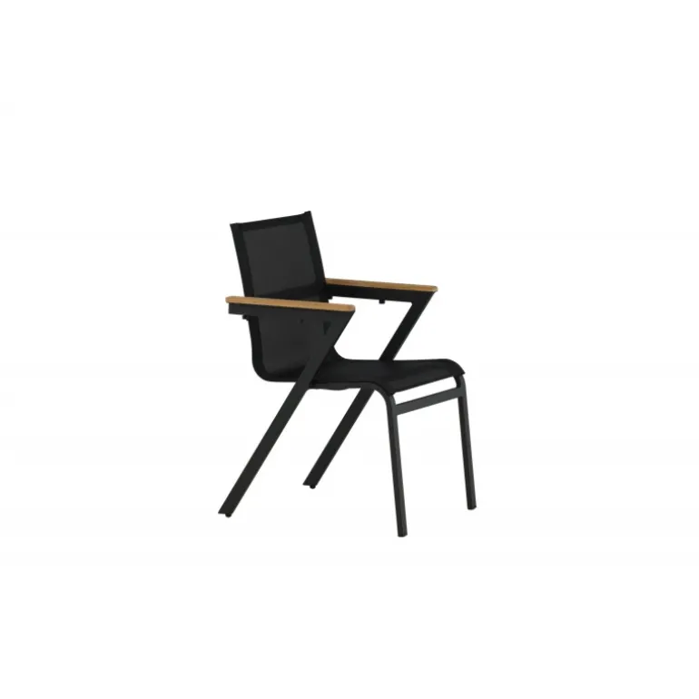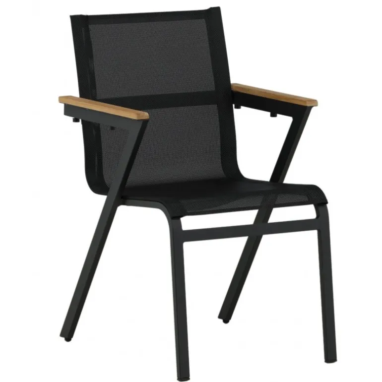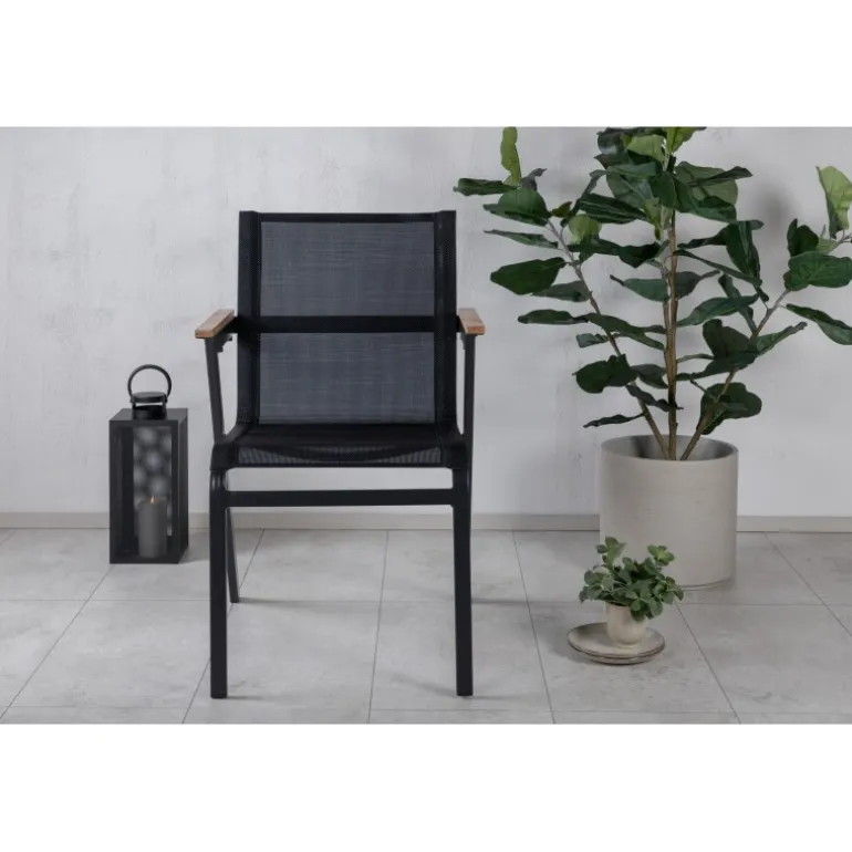 Gør dig klar til sommerens nætter med en tidløs armstol fra Mexico-serien. En sort, smagfuld spisestol, der passer perfekt til både moderne og klassiske spiseborde. Armlænene er lavet af teak, hvilket skaber en flot detalje til det sorte sæde. Stolen er stabelbar, hvilket gør den nem at opbevare. Sid komfortabelt og nyd dejlige måltider udendørs! Plejeråd: Vores møbler i tekstil er normalt kombineret med teak eller aluminium. Textilene er et syntetisk stof lavet af PVC-behandlet polyester. Materialet er vandafvisende og UV-behandlet for at modvirke solens blegning.