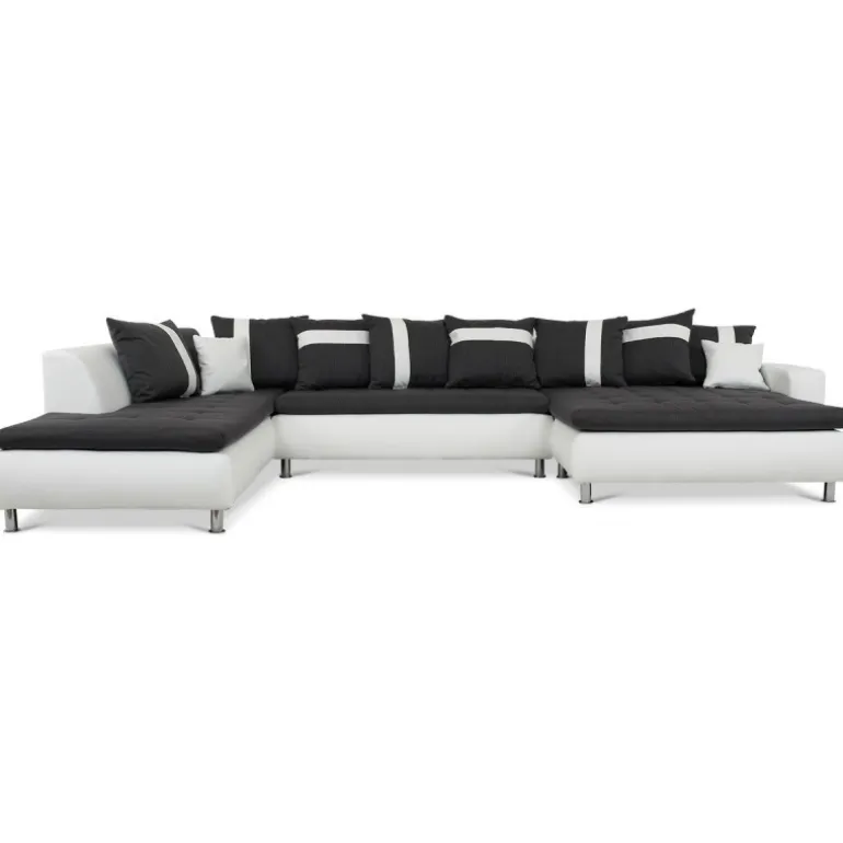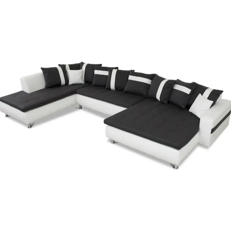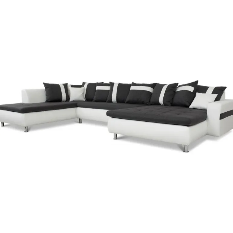 Miami U-sofa med venstrevendt chaiselong betrukket med stof på sæder og hvidt tekstillæder. En sofa i moderne og ekstraordinært design, som skiller sig ud fra mængden af ensartede sofaer. En kæmpe flyder sofa med ekstraordinært meget siddeplads samt god komfort. Sofaen har en blød koksgrå siddehynde med flotte kvadrat syninger, og kommer med 8 store og 2 små puder. Med denne stilfulde sofa sikrer du siddeplads til hele familien.