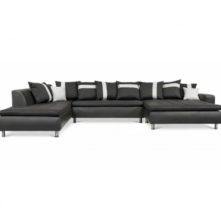 Miami U-sofa med venstrevendt chaiselong betrukket med stof på sæder og hvidt/sort tekstillæder. En sofa i moderne og ekstraordinært design, som skiller sig ud fra mængden af ensartede sofaer. En kæmpe flyder sofa med ekstraordinært meget siddeplads samt god komfort. Sofaen har en blød koksgrå siddehynde med flotte kvadrat syninger, og kommer med 8 store og 2 små puder. Med denne stilfulde sofa sikrer du siddeplads til hele familien.