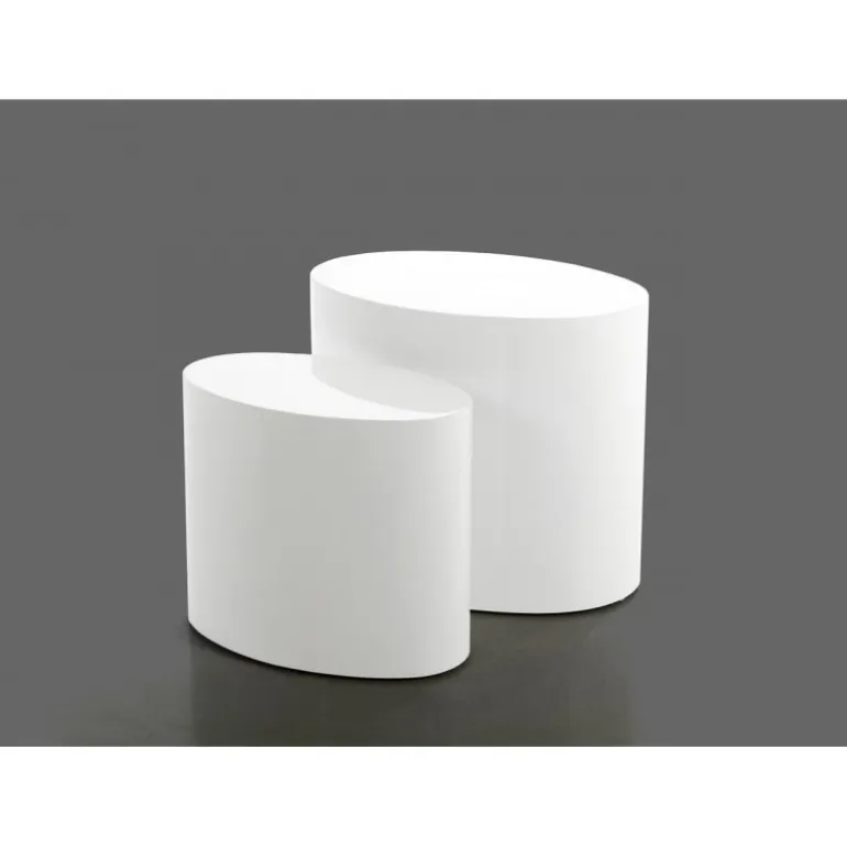 Unikt sofabordssæt med to borde udført i hvidlakeret højglans træ. Bordets spændende og nytænkende design tilfører indretningen et eksklusivt udtryk.