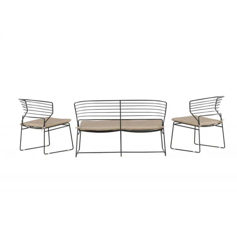 Denne loungegruppe fra Milano-serien skaber et imponerende indtryk på din terrasse og bliver hurtigt et moderne blikfang! Det skandinaviske design er tidløst med sine bløde nordiske former og minimalistiske stil. Sædet er blødt polstret i gråt polyesterstof, og benrammen er stilfuldt slank i sort stål med en lav rygstøtte. Sættet inkluderer en to-personers sofa og to lænestole. Saml dine kære og nyd sene sommeraftener sammen i en komfortabel loungegruppe, der også dekorerer din terrasse!