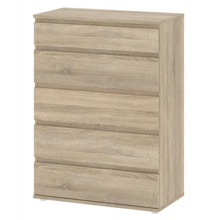 Millennium kommode i egstruktur med 5 skufffer. Det særlige ved Millennium er den usynlige detalje: Fronterne på skuffer og skabe er grebsfri og uden kantbånd. I stedet er folien foldet om kanten på en måde, så der ingen synlige samlinger er. Samtidig gør foldemetoden kanten meget mere behagelig at tage ved med hænderne. Den øverste kant på låger og skuffer er desuden skåret i en 45 graders vinkel, så den er nem at gribe om.