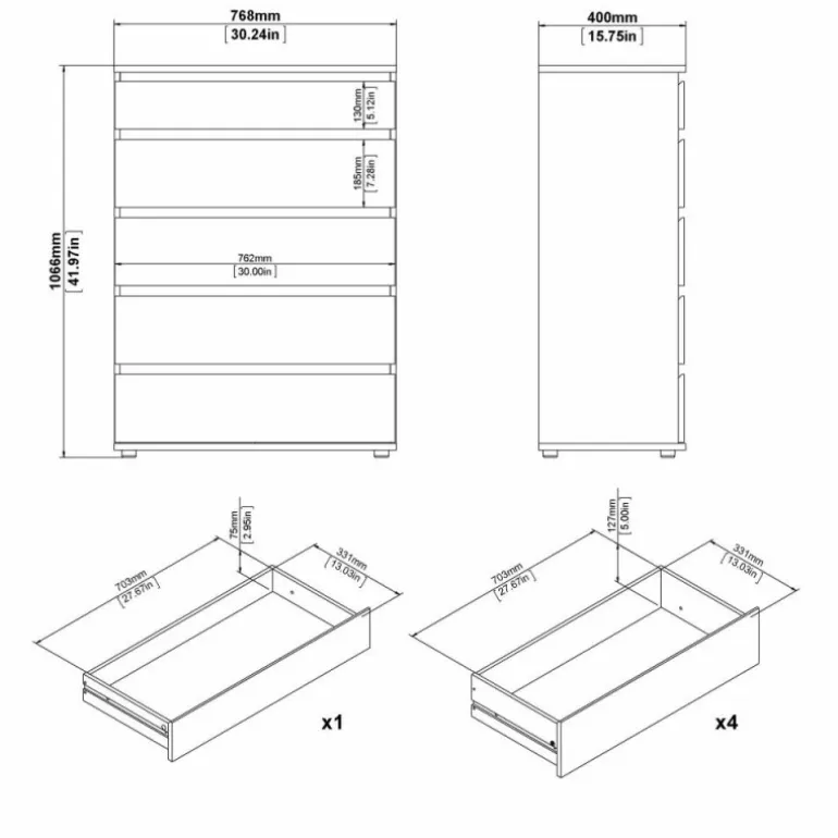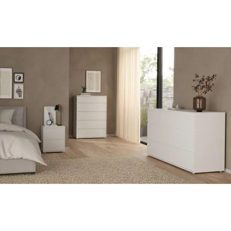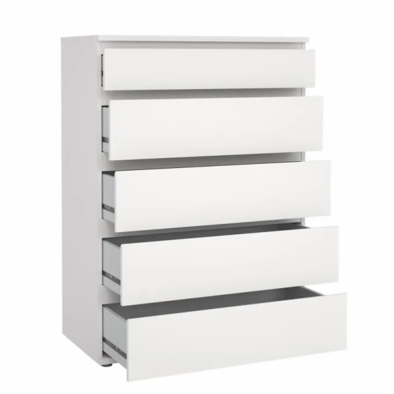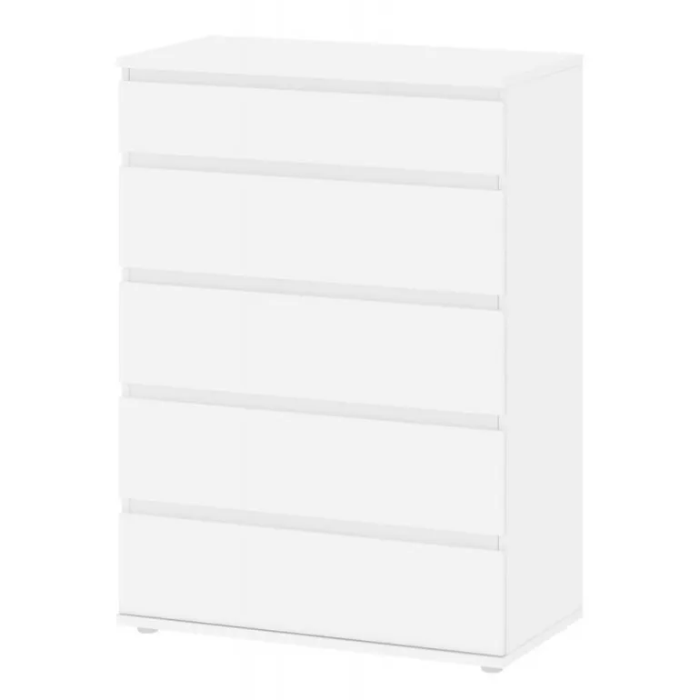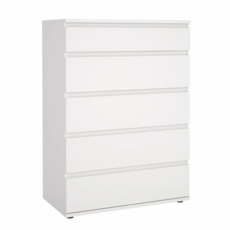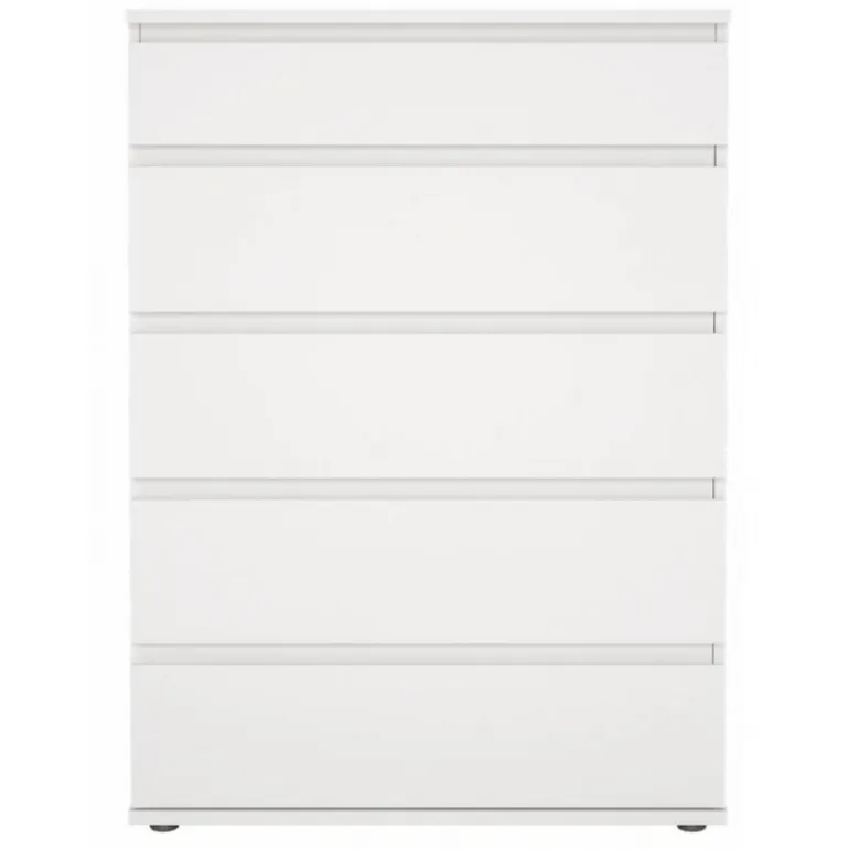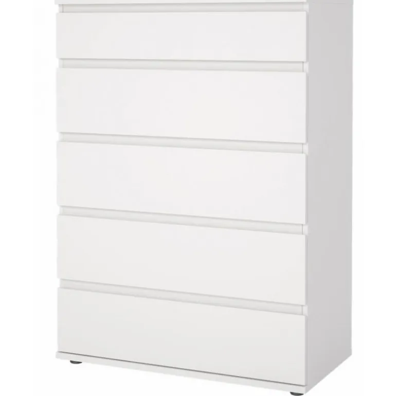 Millennium kommode i hvid med 5 skufffer. Det særlige ved Millennium er den usynlige detalje: Fronterne på skuffer og skabe er grebsfri og uden kantbånd. I stedet er folien foldet om kanten på en måde, så der ingen synlige samlinger er. Samtidig gør foldemetoden kanten meget mere behagelig at tage ved med hænderne. Den øverste kant på låger og skuffer er desuden skåret i en 45 graders vinkel, så den er nem at gribe om.