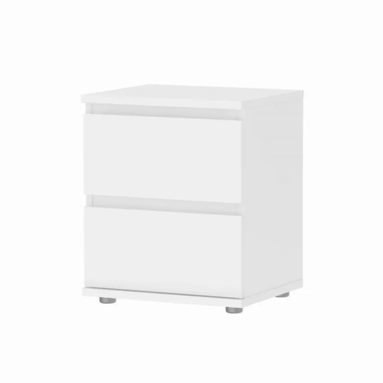 Millennium natbord i hvid med 2 skufffer. Det særlige ved Millennium er den usynlige detalje: Fronterne på skuffer og skabe er grebsfri og uden kantbånd. I stedet er folien foldet om kanten på en måde, så der ingen synlige samlinger er. Samtidig gør foldemetoden kanten meget mere behagelig at tage ved med hænderne. Den øverste kant på låger og skuffer er desuden skåret i en 45 graders vinkel, så den er nem at gribe om.