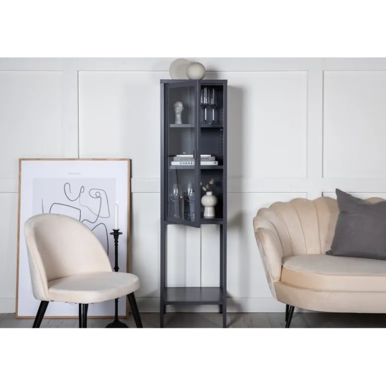 Sheet kabinetter er en populær og praktisk tilføjelse til indretningen! Dette kabinet i Misha-serien har en statelig højde med et moderne industrielt design, lavet af pulverlakeret grå stål med en glasdør. Glasset lader lyset strømme ind i kabinettet og fremhæver smukt alt, hvad du fylder det med. Der er tre smarte hylder, som kan bruges til opbevaring af porcelæn, bøger eller dekoration med smukke indretningsdetaljer. Dimensioner: Længde: 40,5 cm, bredde: 35 cm, højde: 150 cm. Let montering kræves. Plejeanbefalinger: Aluminium og krom er to materialer, der afviser snavs og væsker. Vær dog opmærksom på, at vand kan forårsage pletter og rust. Tør derfor overfladen af med en blød, fugtig klud og sæbevand. Hvis pletterne eller rusten sidder for hårdt, anbefales en blød klud fugtet i ren alkohol.