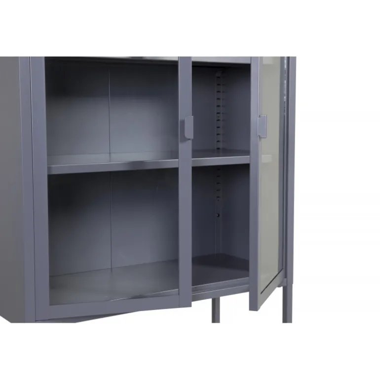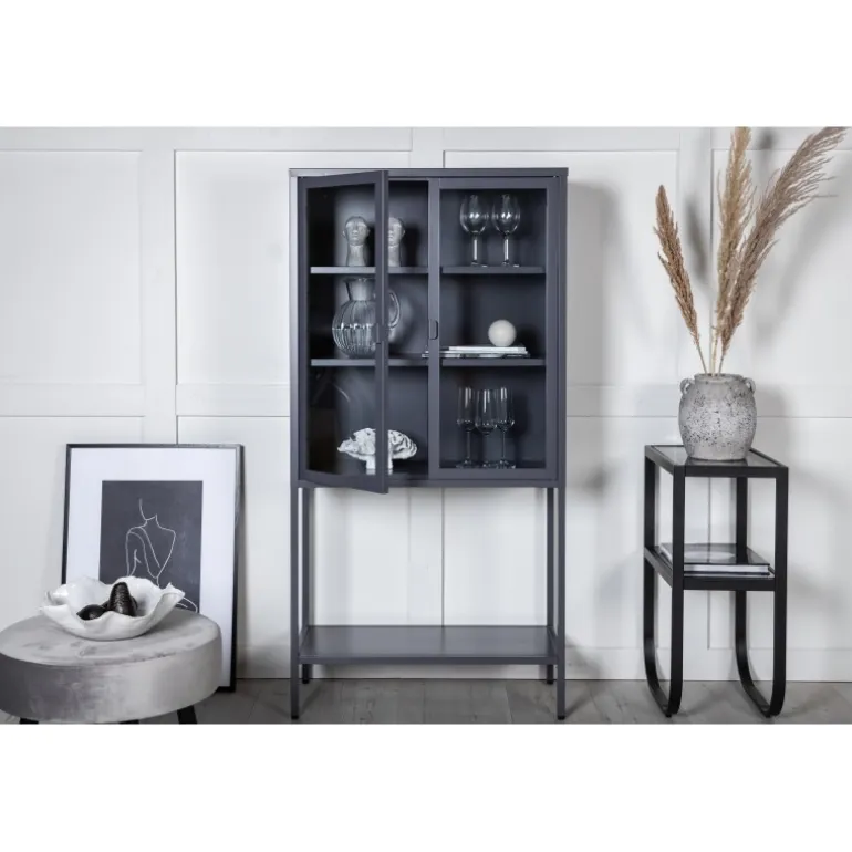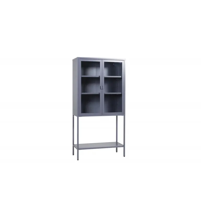 Misha Skab er en elegant opbevaringsmøbel med et praktisk og stilfuldt design! Misha, i moderne nordisk design med rene linjer, er lavet af pulverlakeret grå stål med to glasdøre, der giver et smukt lysindfald. Skabet har en imponerende højde, der åbner rummet og skaber en trendy atmosfære. Dette vitrineskab er yderst anvendeligt. Der er tre hylder, som du kan fylde efter dine egne behov og ønsker – smukt porcelæn, bøger eller stilfulde interiørdetaljer – valget er dit! Se vores billeder for inspiration. Lettere samling er påkrævet. Plejeråd: Aluminium og krom er to materialer, der afviser snavs og væsker. Du skal dog være opmærksom på, at vand kan forårsage pletter og rust. Sørg derfor for at tørre overfladen af med en blød, fugtig klud og sæbevand. Hvis pletterne eller rusten sidder for hårdt, anbefales en blød klud fugtet i ren alkohol.