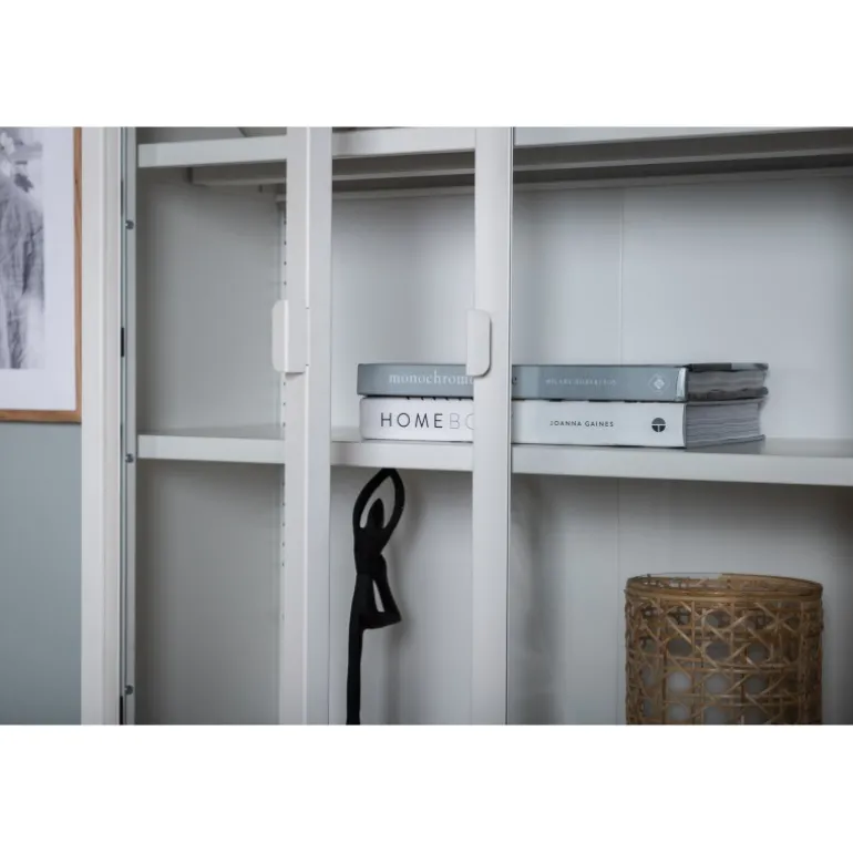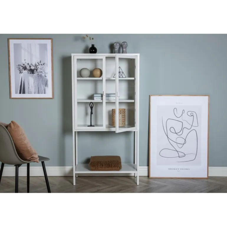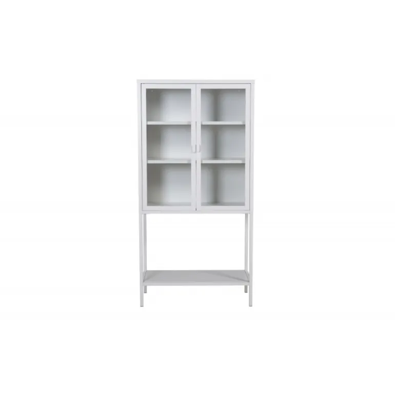 Et elegant opbevaringsmøbel med praktisk og stilfuldt design! Misha, i moderne nordisk stil med lige linjer, er lavet af hvid pulverlakeret stål med to glasdøre for dejligt lysindfald. Skabet har en imponerende højde, der åbner rummet og skaber en trendy, lys atmosfære. Dette vitrineskab er yderst anvendeligt. Der er tre hylder til opbevaring, som du kan fylde efter dine egne behov og ønsker – smukt porcelæn, bøger eller stilfulde interiørdetaljer – valget er dit! Se vores billeder for inspiration. Lettere samling kræves. Plejevejledning: Aluminium og krom er to materialer, der afviser snavs og væsker. Dog skal du være opmærksom på, at vand kan forårsage pletter og rust. Sørg derfor for at tørre overfladen af med en blød, fugtig klud og sæbevand. Hvis pletterne eller rusten sidder for hårdt, anbefales det at bruge en blød klud fugtet med ren alkohol.