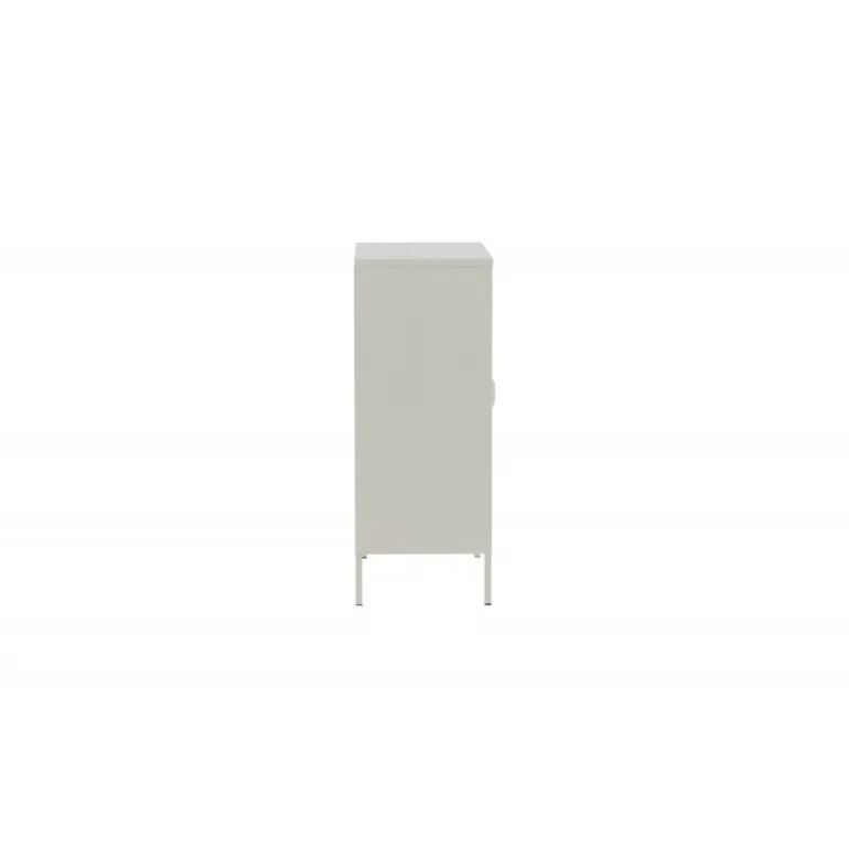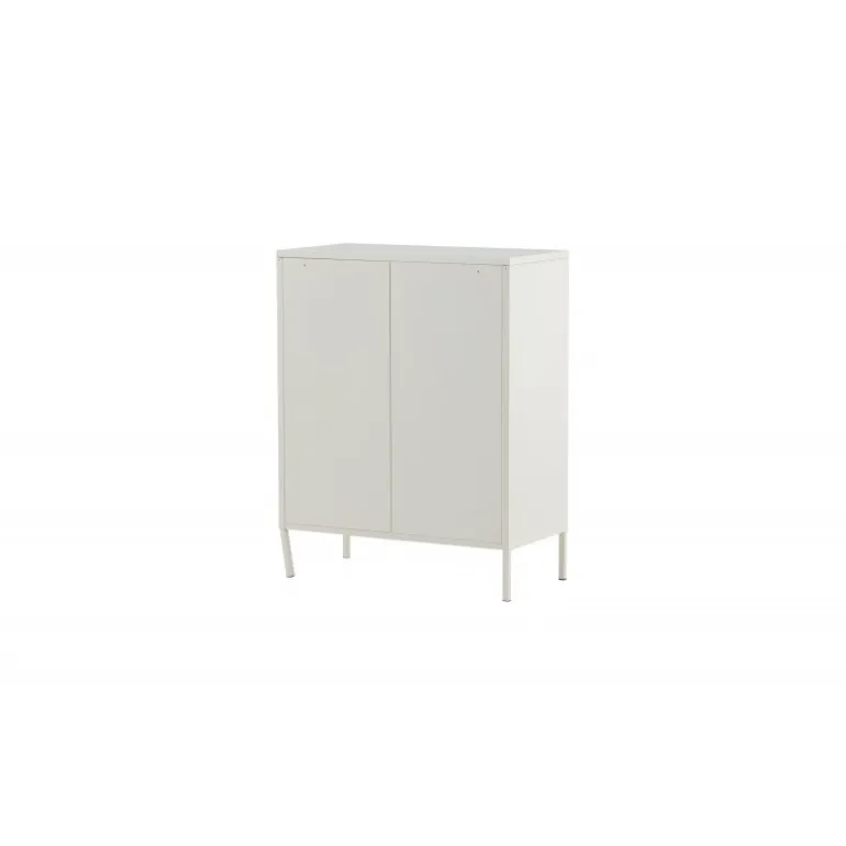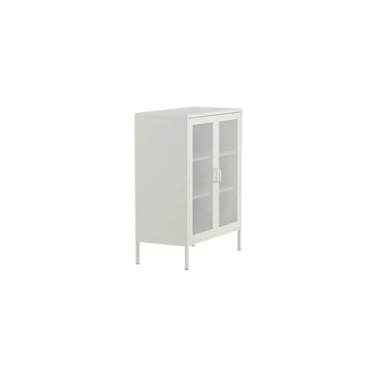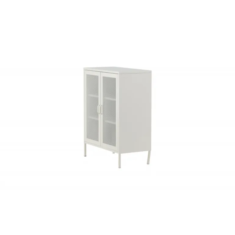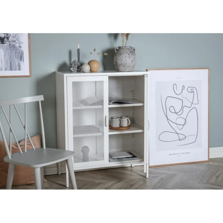 Misha, i et robust industrielt design med lækre mesh-døre og ben i hvid pulverlakeret stål, har 3 smarte hylder til opbevaring. Skabet løftes af slanke, høje ben, der skaber en luftig følelse og gør det lettere for støvsugeren at komme til. Det perfekte opbevaringsmøbel til alt det, du ønsker – fyld det med porcelæn, bøger eller smukke dekorationer. Den fleksible størrelse og elegante udseende gør det nemt at placere og passer godt ind i de fleste rum i hjemmet, så indret efter dine egne behov og ønsker! Plejeråd: Aluminium og krom er to materialer, der afviser snavs og væsker. Bemærk dog, at vand kan forårsage pletter og rust. Derfor skal du sørge for at tørre overfladen af med en blød, fugtet klud og sæbevand. Hvis pletterne eller rusten sidder for hårdt, anbefales en blød klud fugtet i ren alkohol.