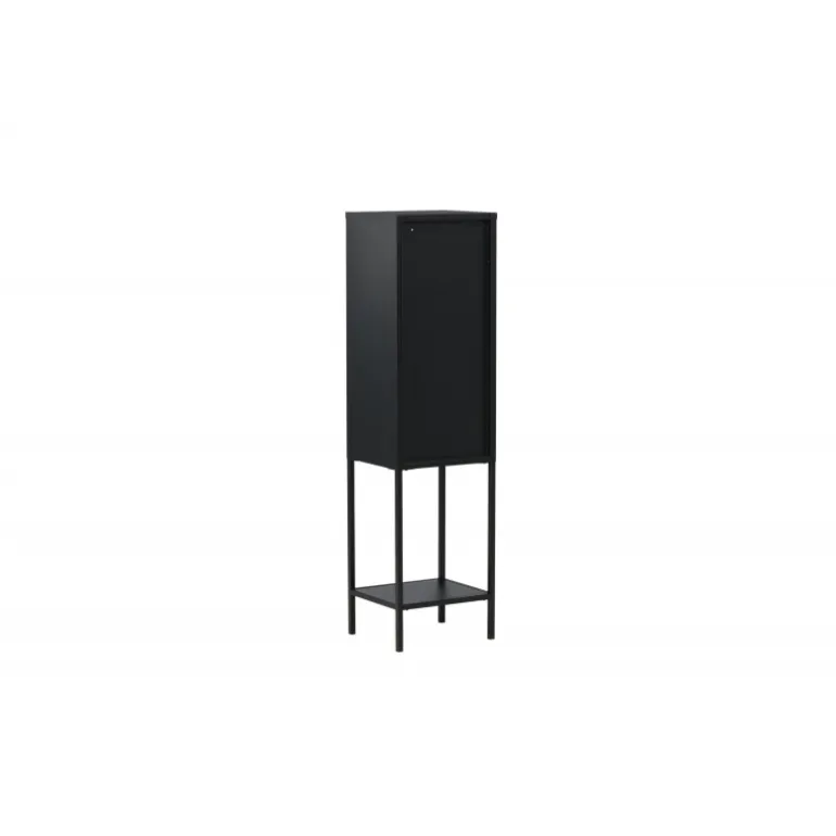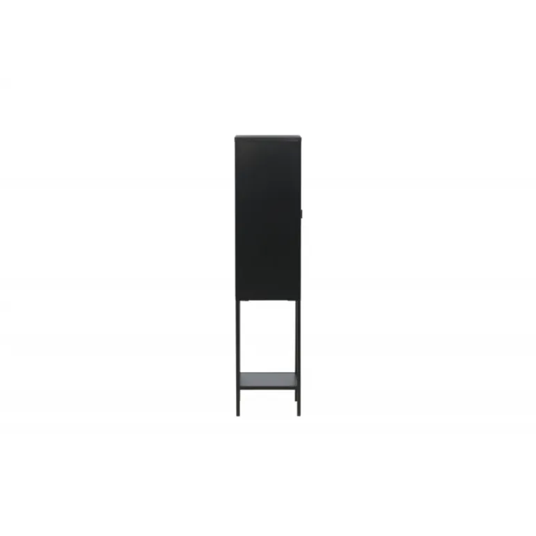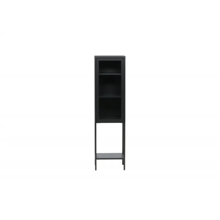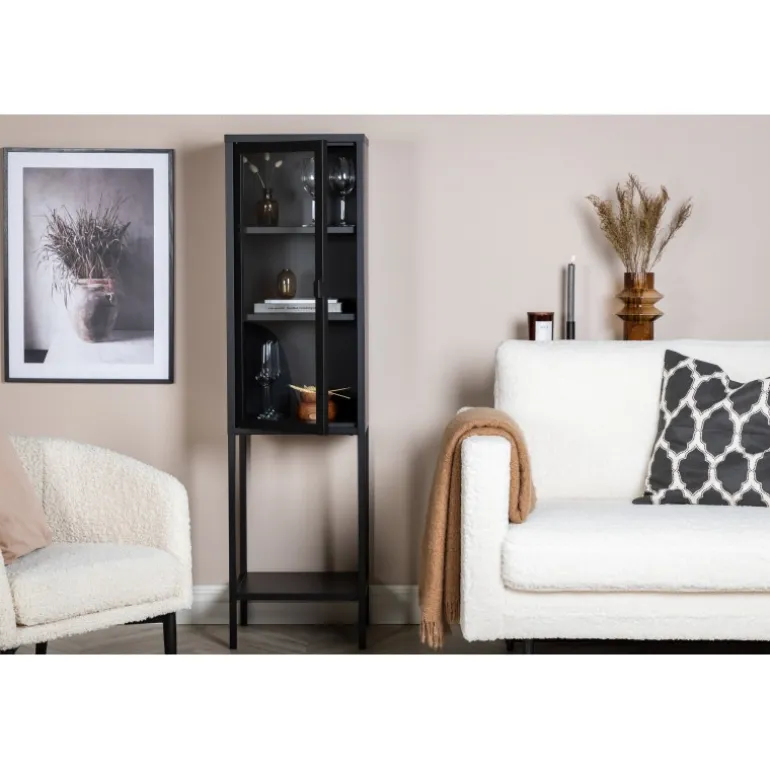 Sheet-skabe er en populær og praktisk tilføjelse til interiøret! Dette skab i Misha-serien har en statelig højde i moderne industrielt design, lavet af pulverlakeret sort stål med en glasdør. Glasset lader et dejligt lys ind i skabet og fremhæver smukt alt, hvad du fylder det med. Der er tre smarte hylder, som kan bruges til at opbevare porcelæn, bøger eller dekorere med smukke interiørdetaljer. Dimensioner: Længde: 40,5 cm, bredde: 35 cm, højde: 150 cm. Lettere samling er påkrævet. Plejeanvisning: Aluminium og krom er to materialer, der afviser snavs og væsker. Du skal dog være opmærksom på, at vand kan forårsage pletter og rust. Sørg derfor for at tørre overfladen af med en blød fugtet klud og sæbevand. Hvis pletter eller rust sidder for hårdt, anbefales en blød klud fugtet i ren alkohol.