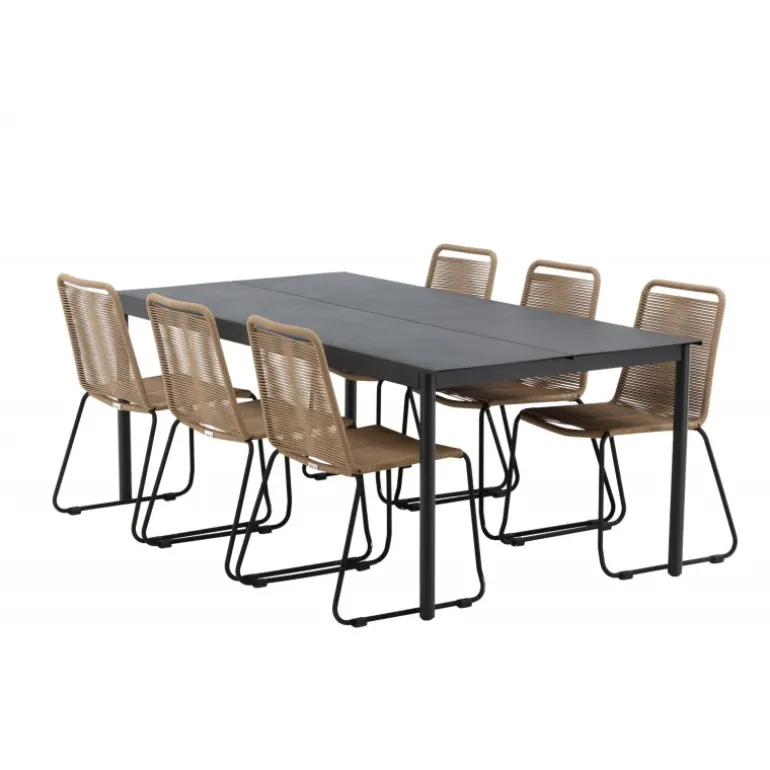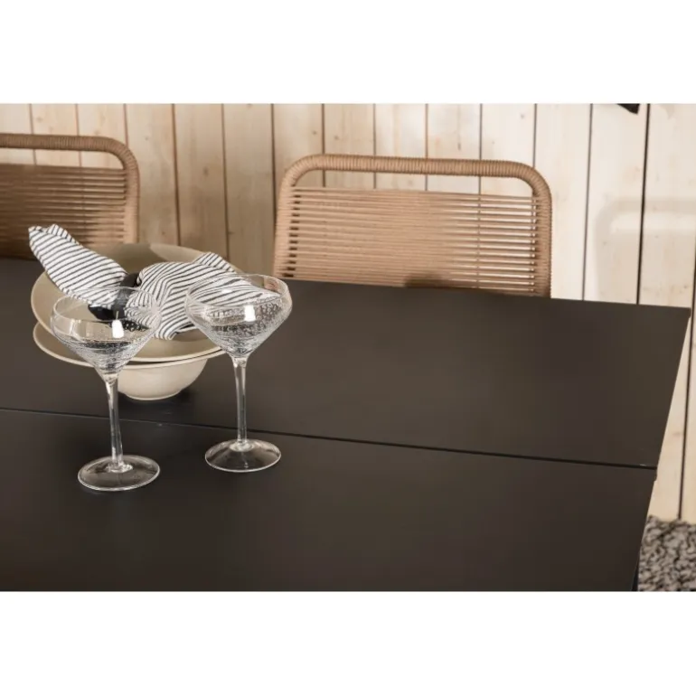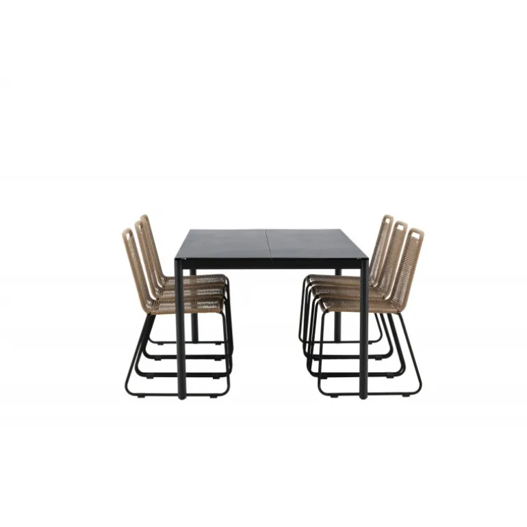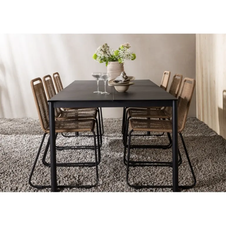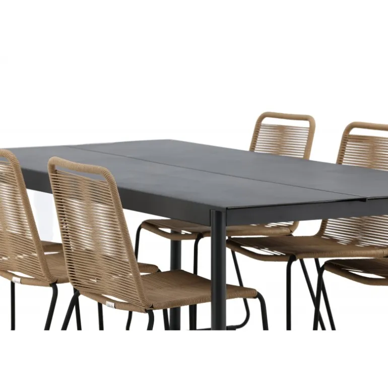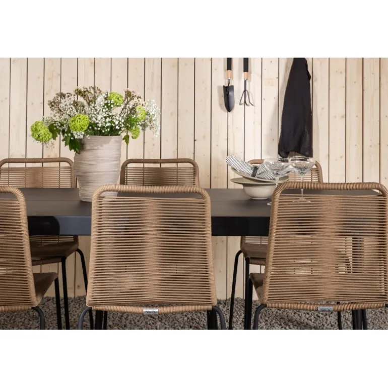 Inviter til mange sociale begivenheder i fremtiden! Modena er vores populære spisebord i lige, nordiske former, som rummer plads til mange. Bordet har en rektangulær bordplade i sort aluminium og cylindriske ben i minimalistisk stil. Her i en modebevidst kombination med vores lækre spisestole Lindos i jordfarver. Stolene kan stables for praktisk opbevaring og er lavet af holdbart reb i en dejlig lattefarve. Sid komfortabelt og hyggeligt i en indbydende Loungesæt – Havemøbelsæt!