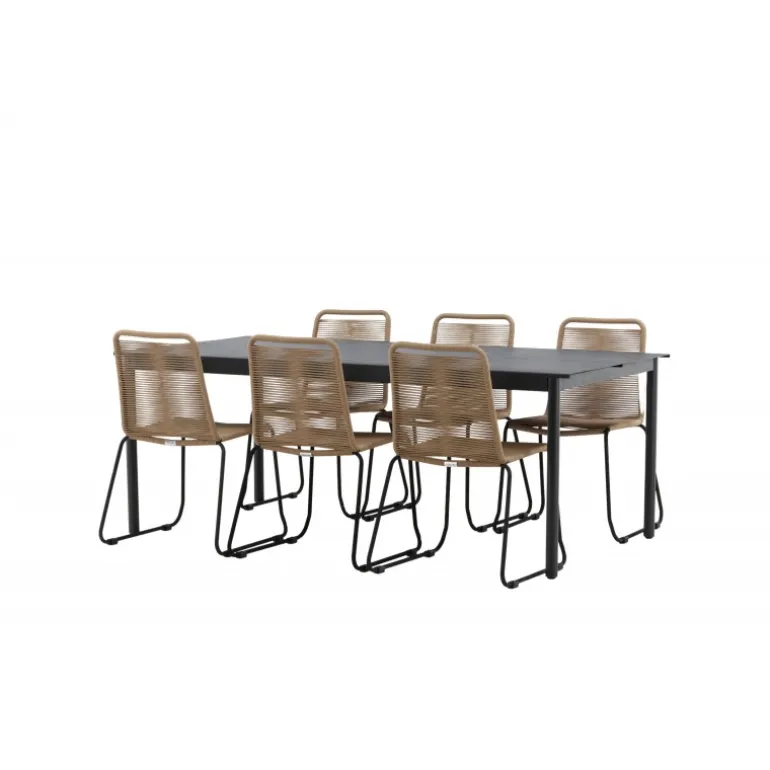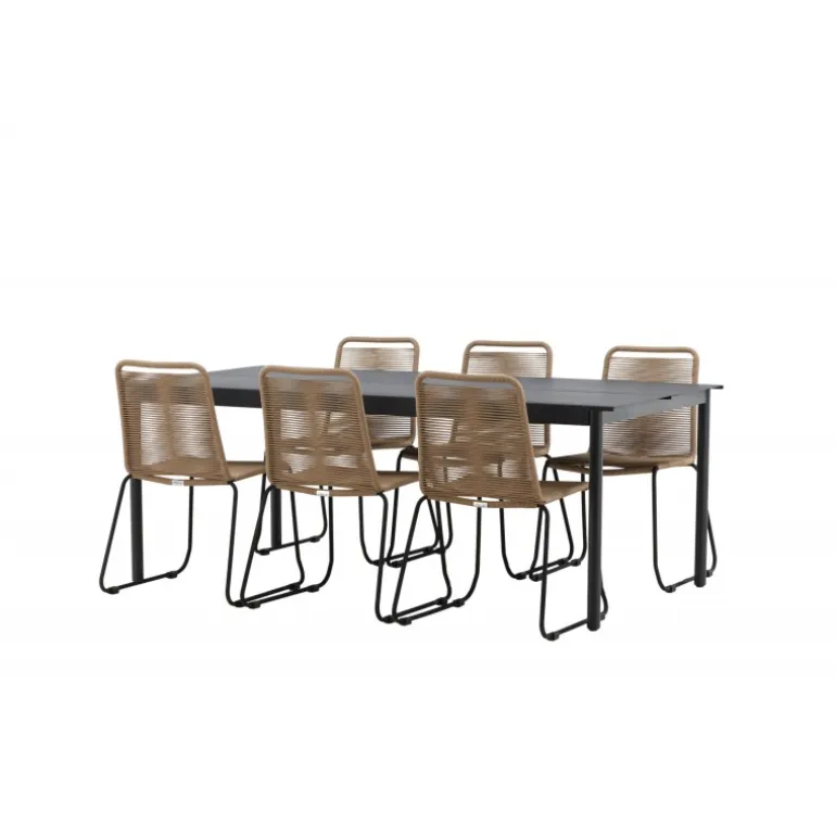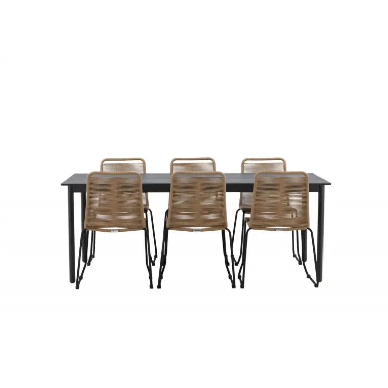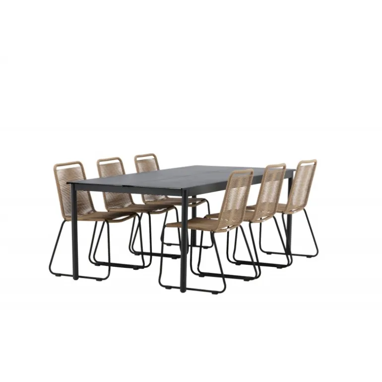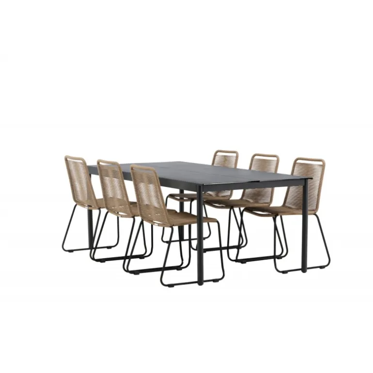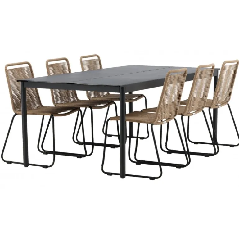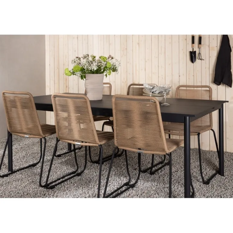 Inviter til mange sociale begivenheder i fremtiden! Modena er vores populære spisebord i lige, nordiske former, som rummer plads til mange. Bordet har en rektangulær bordplade i sort aluminium og cylindriske ben i minimalistisk stil. Her i en modebevidst kombination med vores lækre spisestole Lindos i jordfarver. Stolene kan stables for praktisk opbevaring og er lavet af holdbart reb i en dejlig lattefarve. Sid komfortabelt og hyggeligt i en indbydende Loungesæt – Havemøbelsæt!