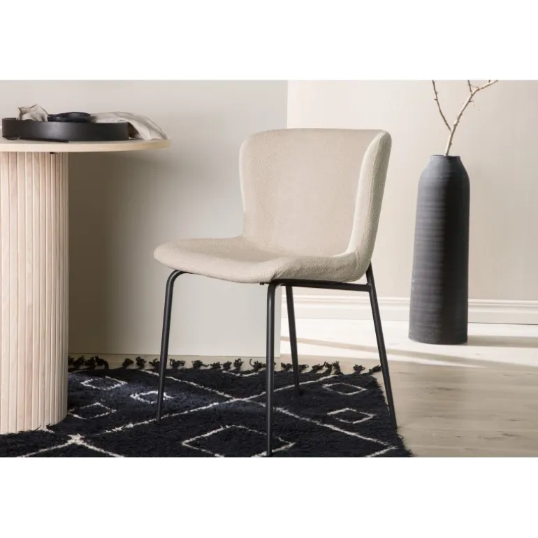Modesto – Vores populære spisestol, der både er tidløs og komfortabel! Skab en indbydende atmosfære i hjertet af hjemmet med denne bløde spisestol i skandinavisk design. Stolen er helt beklædt i beige boucléstof med stilfulde, smalle stoleben i sort metal. Den let rundede ryg og polstrede sædepude giver ekstra komfort og gør måltiderne omkring spisebordet endnu mere behagelige. Det skal føles rart at sætte sig til et godt måltid!