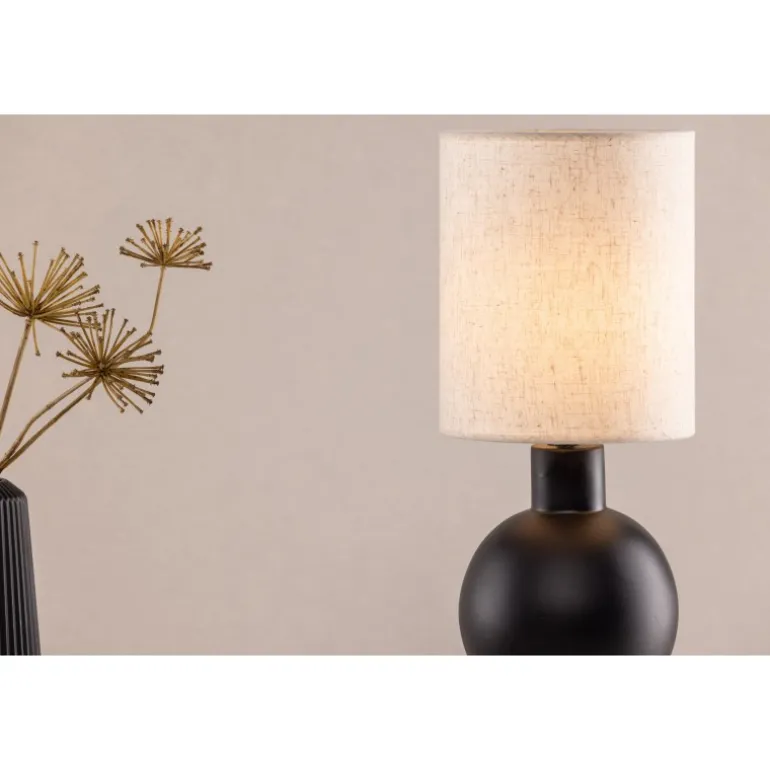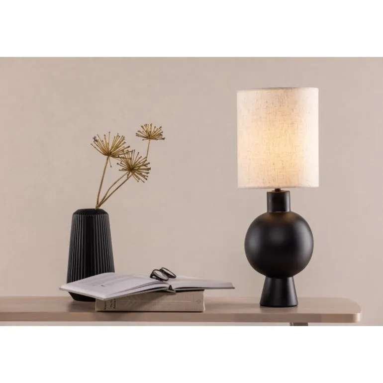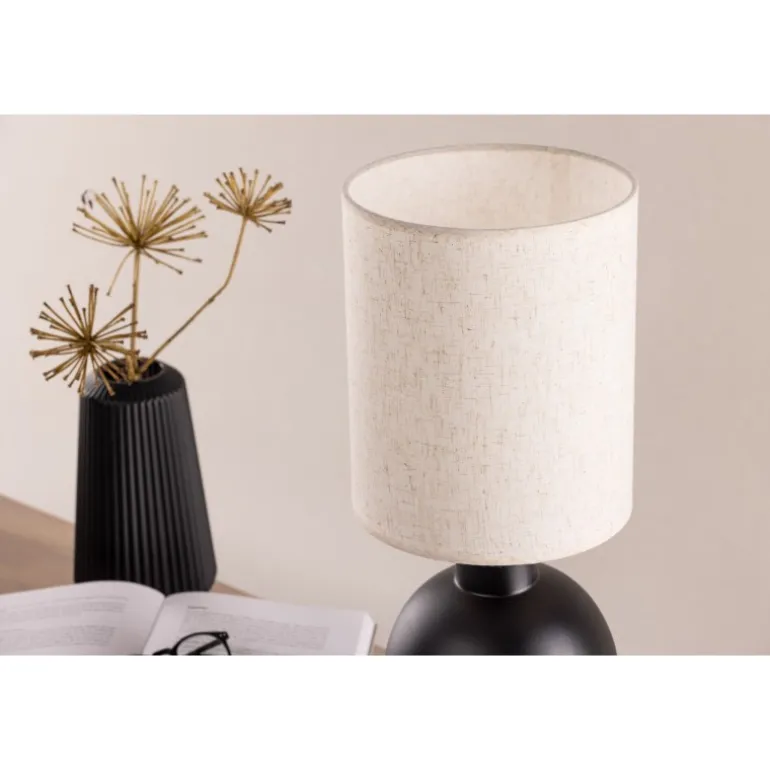 - Dekorativt og stilfuldt design: Sort betonbase kombineret med beige linnedskærm.