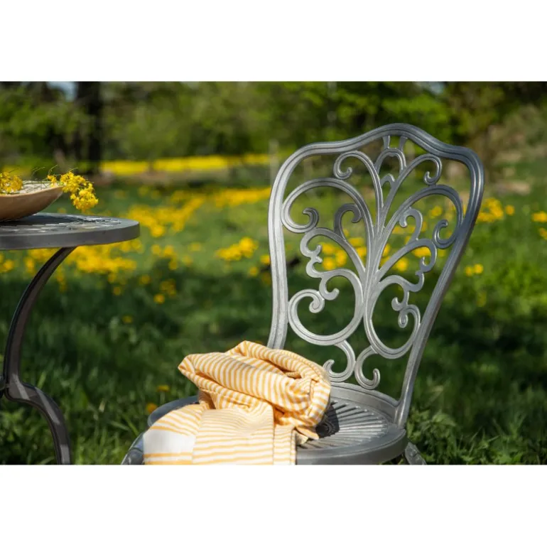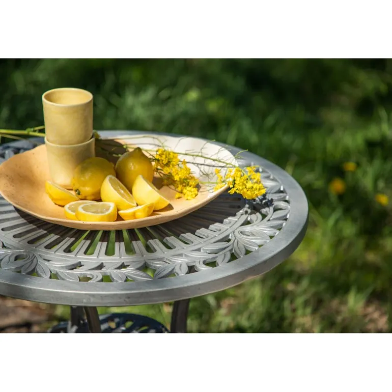 En klassisk cafébord i et charmerende og nostalgisk design. Dette elegante bord fra Nandin-serien har en rund top med mønster og tre snoede ben i aluminium. Dæk bordet til kaffe i sommer og nyd afslappende øjeblikke i solen!