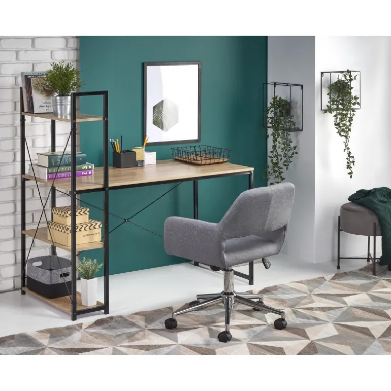 NARVIK B1 skrivebord – perfekt til hjemmekontoret eller arbejdspladsen. Med dimensionerne 120/64/120 cm er det rummeligt nok til alle dine arbejdsbehov. Lavet af lamineret spånplade og pulverlakeret stål, kombinerer det holdbarhed og elegant design. Fås i en Sort/sonoma eg farvekombination, som passer til de fleste interiører. Den fleksible reol kan monteres både på venstre eller højre side, hvilket giver dig frihed til at tilpasse det til dit rum.