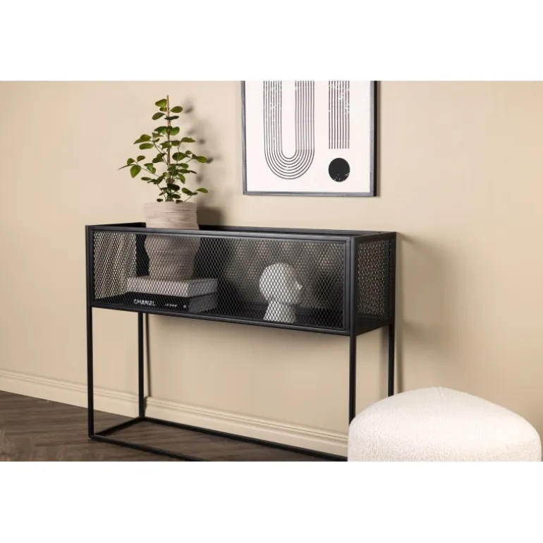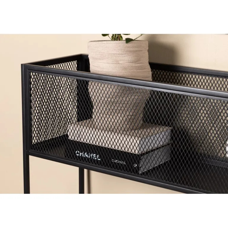 Indret dit hjem moderne og smart med hjælp fra Netz hylde! Denne lækre sidebord/hylde har et slankt industrielt design med en hylde til opbevaring, net sider rundt om hele opbevaringsfladen og smalle høje ben i sort stål. Den fleksible størrelse og elegante udformning gør det nemt at placere og passer godt ind i de fleste rum i hjemmet. Indret efter dine egne behov og ønsker med smukke dekorationer, blomster eller andre ting, der skal opbevares – kun fantasien sætter grænser!