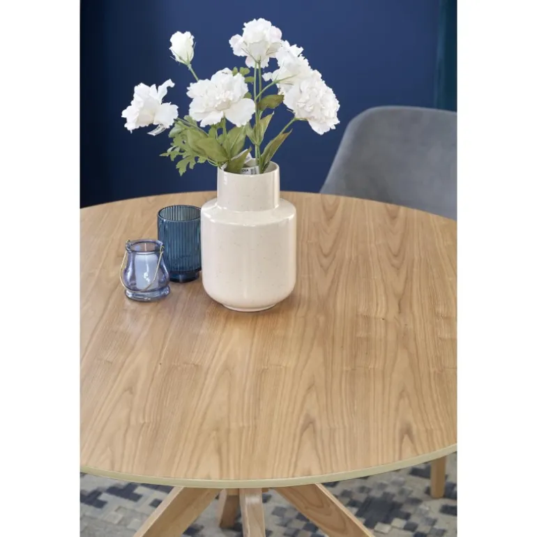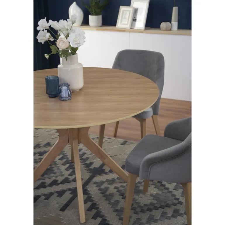 Oplev det smukke NICOLAS bord i naturlig eg, perfekt til din stue eller spisestue. Med en diameter på 120 cm og en højde på 77 cm tilbyder dette bord både stil og funktionalitet. Lavet af MDF med naturlig finer og massivt træ, sikrer det holdbarhed og elegance. Dette bord vil med sin naturlige egefarve passe perfekt ind i enhver indretning, og dets robuste konstruktion gør det ideelt til daglig brug.