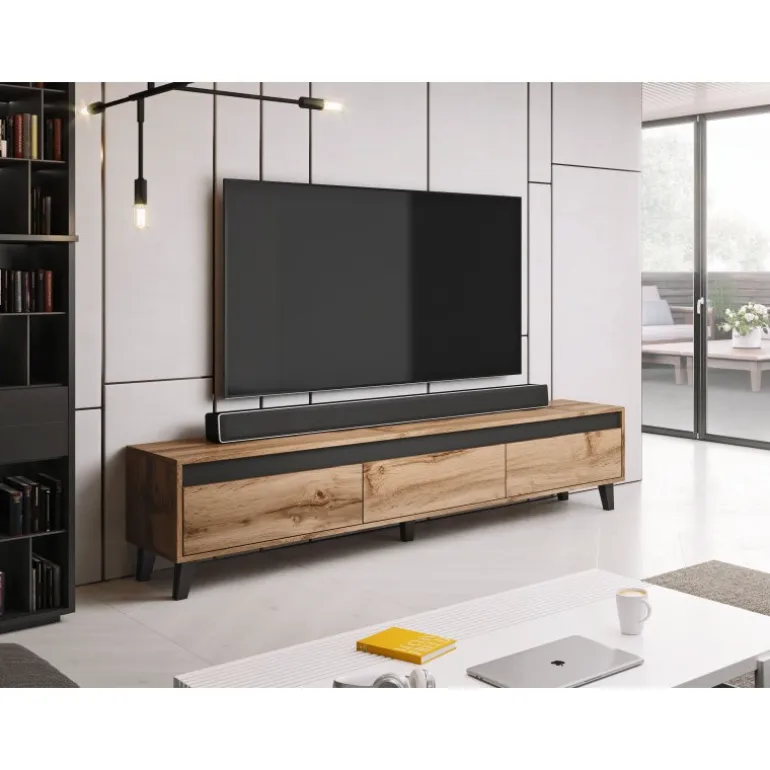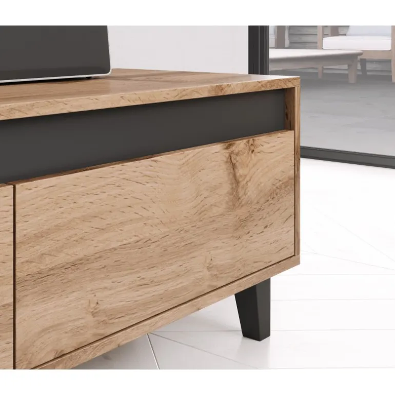 NORD RTV DAB WOTAN/ANTRACYT er en stilfuld og funktionel TV-bænk, der passer perfekt til moderne hjem. Dens dimensioner er 42cm i højde, 185cm i bredde og 38cm i dybde, hvilket gør den ideel til stuer i alle størrelser. Fremstillet af lamineret mat spånplade i både krop og front, tilbyder denne TV-bænk både holdbarhed og et elegant udseende. Skufferne kommer med PUSH TO OPEN funktion, som sikrer nem adgang og et minimalistisk design uden synlige håndtag. Perfekt til opbevaring af elektronik og andre ting, som du ønsker at holde organiseret og ude af syne.