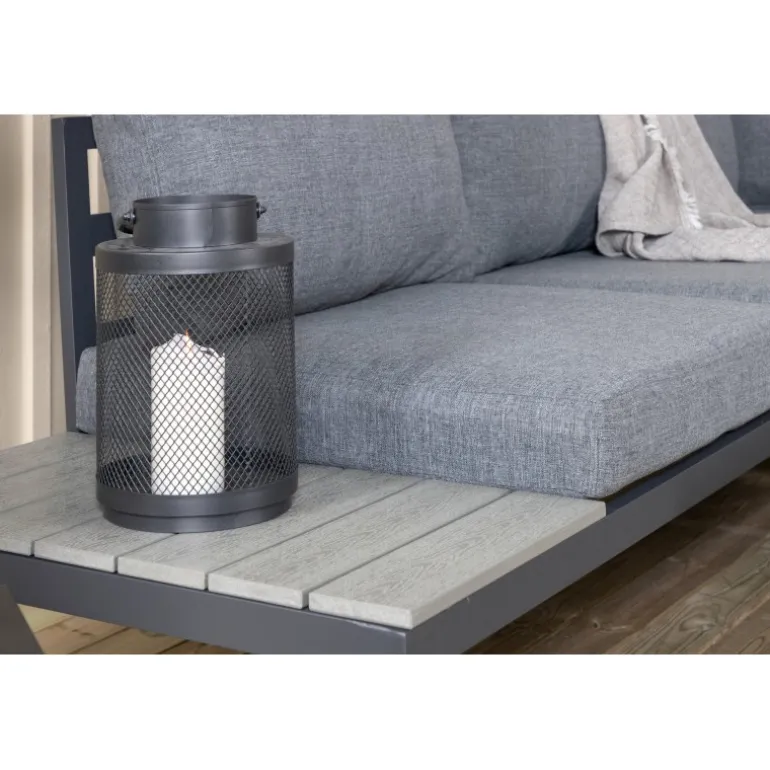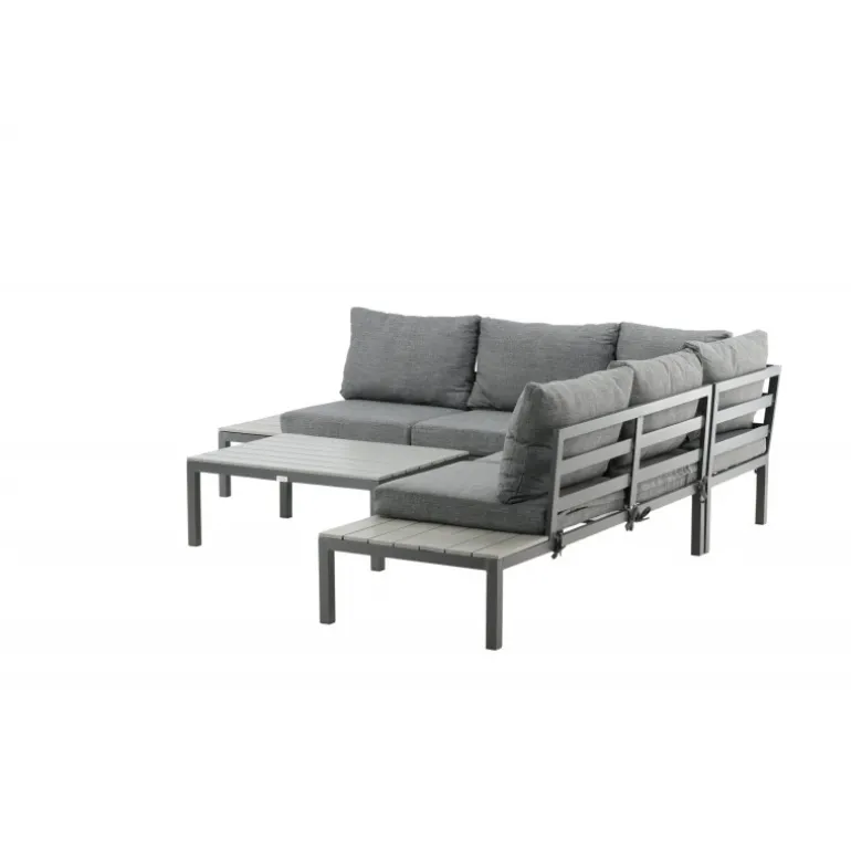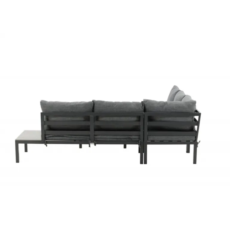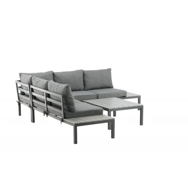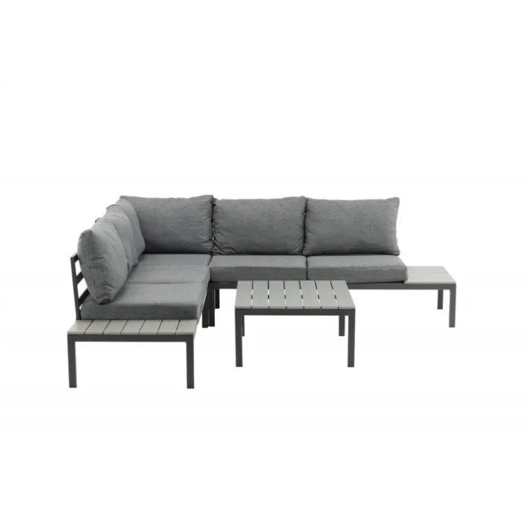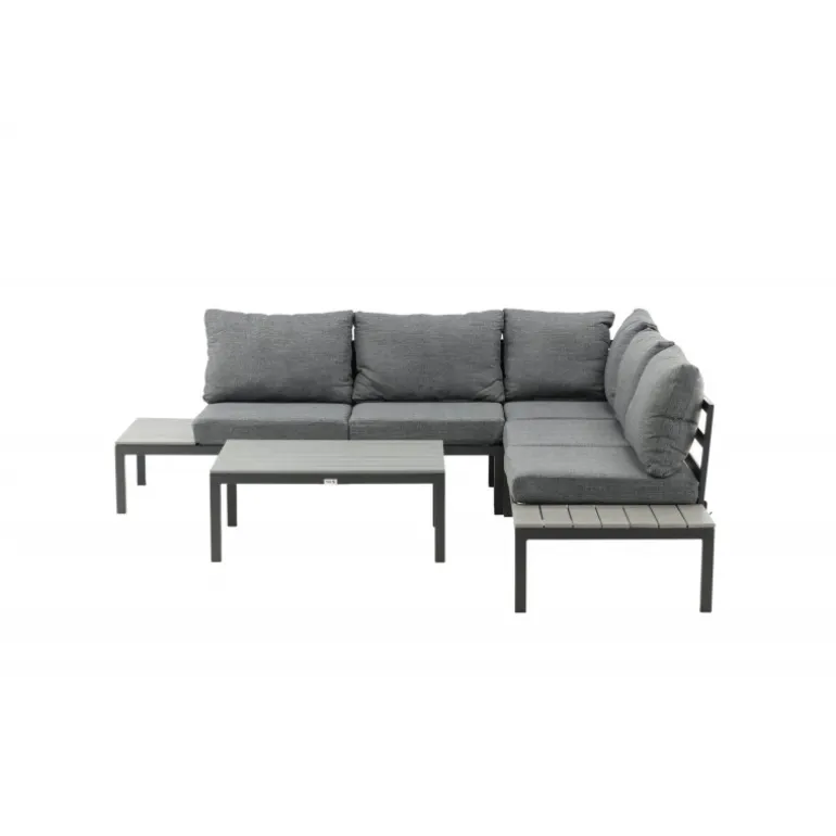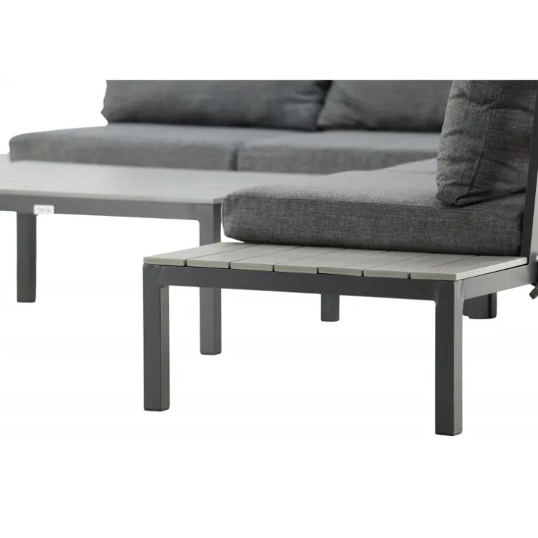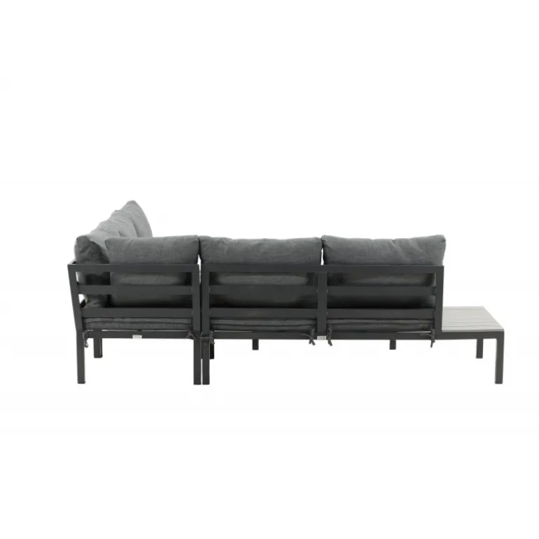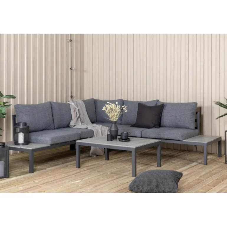 Stilfuld, smart og holdbar – den perfekte sofasæt til terrassen denne sommer! Odense er en klassisk og enkel hjørnegruppesæt i lækkert loungedesign med en sort ramme i aluminium og grå topplade i polywood. På hver side af sofaen er der små “sideborde”, perfekte til ekstra afsætningsplads. Sofasættet er velegnet til udendørs brug og passer lige så godt i haven som i hjørnet af balkonen. Grå puder medfølger, som gør gruppen både stilfuld og komfortabel! Plejeanvisning: Udendørsmøbler i aluminium og rustfrit stål skal rengøres regelmæssigt med vand og mild sæbe. Skyl altid grundigt med rigeligt vand, hvilket bliver ekstra vigtigt, hvis møblerne er placeret i nærheden af havet, hvor salt kan transporteres gennem luften.
