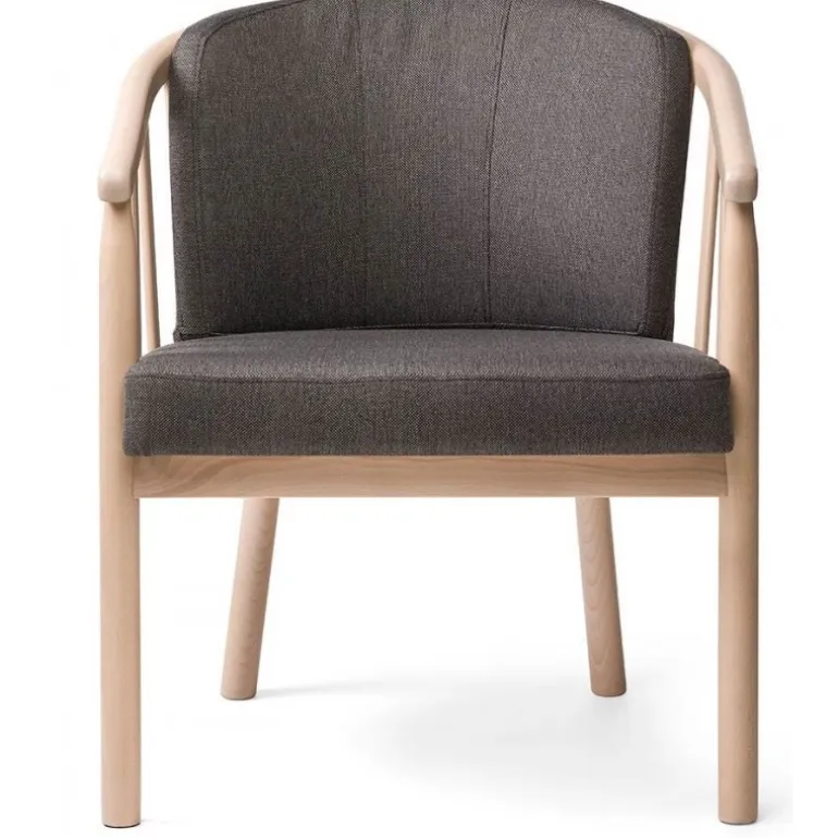 Klassisk og stilren armstol i massiv lakeret bøg. Puderne er monteret med slidstærkt møbelstof. Stolen er let og elegant og passer perfekt ind i ethvert hjem. Rigtig god siddekomfort.