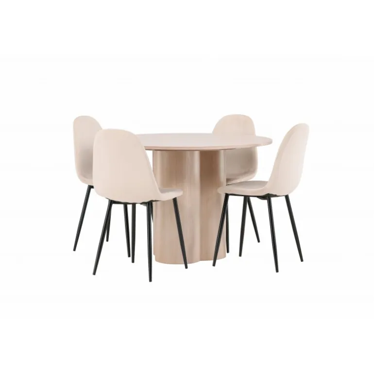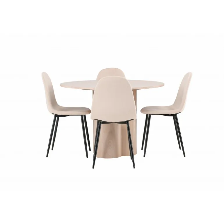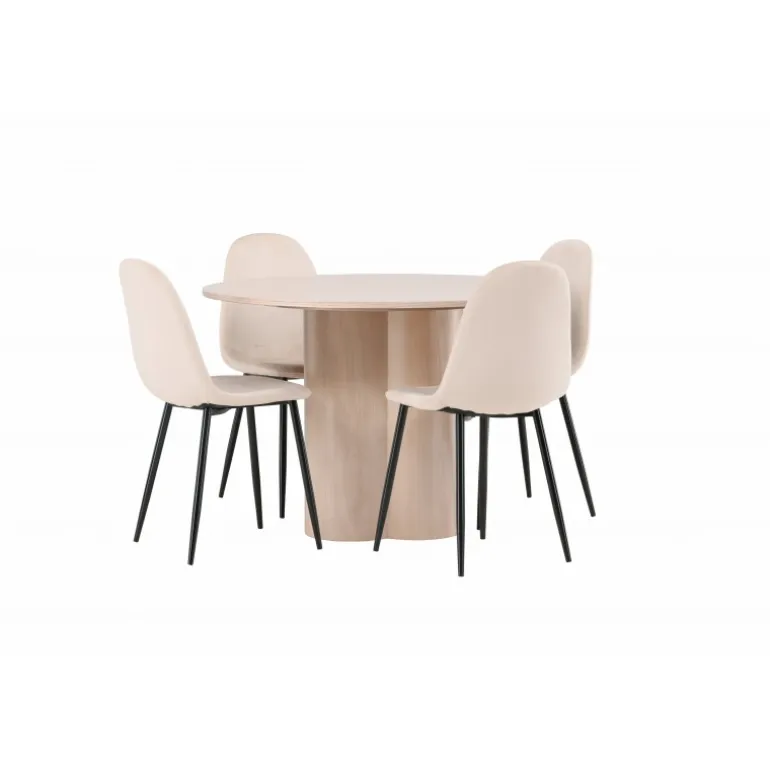 En moderne madgruppe, der inviterer til sociale øjeblikke med dine kære! Spisebordet Olivia har et smagfuldt skandinavisk design og en robust konstruktion. Bordet har et ensartet design i hvidmalet MDF med en tynd, rund bordplade og tre cylindriske ben, der er samlet under midten af bordet. Her sammen med 4 spisebordsstole fra Polar-serien. Stolens ryg er fuldt beklædt i polstret beige velourstof, og benene er i sort pulverlakeret metal. Skab en stilfuld blikfang i hjemmets hjerte – her ender ingen på kanten!