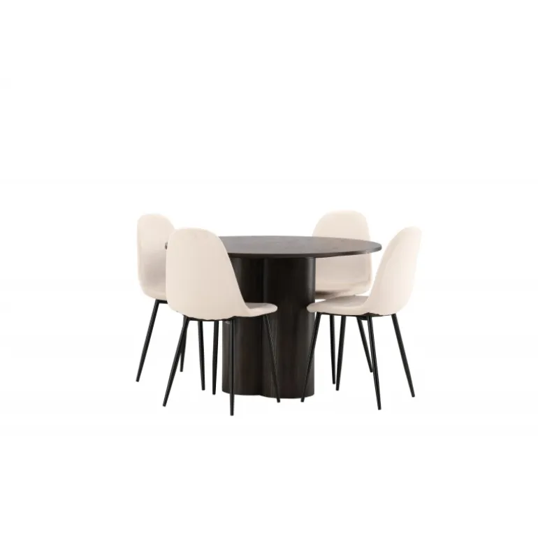 Olivia Rund Spisebordssæt udstråler luksus og bekvemmelighed! Spisebordet Olivia imponerer med sit skandinaviske og smagfulde design. Bordet kommer i en elegant mocca farve i MDF med en tynd, rund top og tre cylinderformede ben, der er samlet under bordets midte. Her kombineret med vores komfortable spisebordsstole fra Polar-serien. Stolen har et fuldt polstret design med en rundet ryg og sæde i beige fløjlstof med blød polstring og ben i sort pulverlakeret metal. Undgå at gå på kompromis mellem komfort og design!