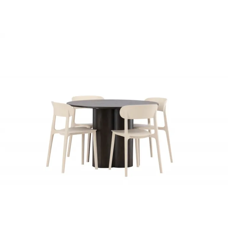 Skab et socialt og charmerende samlingspunkt for familien i dit hjem! Spisebordet Olivia imponerer med sit skandinaviske design. Bordet kommer i en smagfuld mocca farve i MDF med en tynd, rund bordplade og tre cylinderformede ben, der er samlet under midten af bordet. Her sammen med stole fra Åstol-serien i et klassisk design. Stolen er lavet af holdbar plastkomposit i en smagfuld træfarve. De lige nordiske former står tidens prøve. Her får du en indbydende Spisebordssæt!