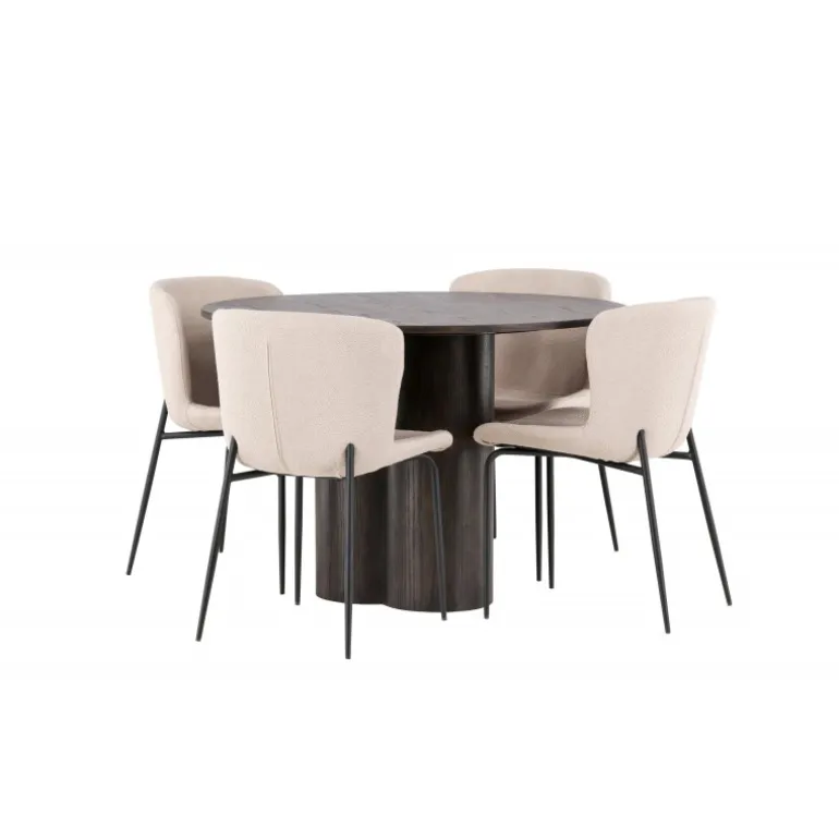 Her er der ingen, der ender på kanten! Den runde spisebord Olivia har et skandinavisk design i en moderne mocca farve. Bordet har en tynd MDF bordplade og tre cylinderformede ben, der er samlet under midten af bordet. Farven har en let dækkende effekt, som gør materialets mønster synligt. Her sammen med modebevidste spisestole fra Modesto serien. Stolen er fuldt polstret i beige pelsstof med stilfulde smalle ben i sort metal. Den let afrundede ryg og polstrede sædepude giver ekstra komfort og forlænger hyggelige måltider omkring spisebordet. Luksuriøst, stilfuldt og komfortabelt!