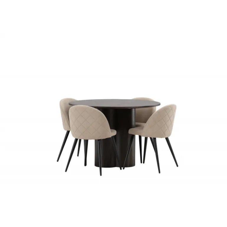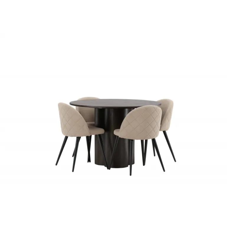 Skab en iøjnefaldende midtpunkt i dit hjem! Spisebordet Olivia imponerer med sit skandinaviske og smagfulde design. Bordet kommer i en elegant mocca farve i MDF med en tynd, rund top og tre cylinderformede ben, der er samlet under midten af bordet. Farven har en let dækning, som gør materialets mønster synligt. Her sammen med spisebordsstole fra Velvet Stitches serien. Denne spisebordsstol har et fuldt polstret design med en let rundet ryg og sæde i beige polyester stof og ben i sort pulverlakeret metal. Sid komfortabelt og behageligt!