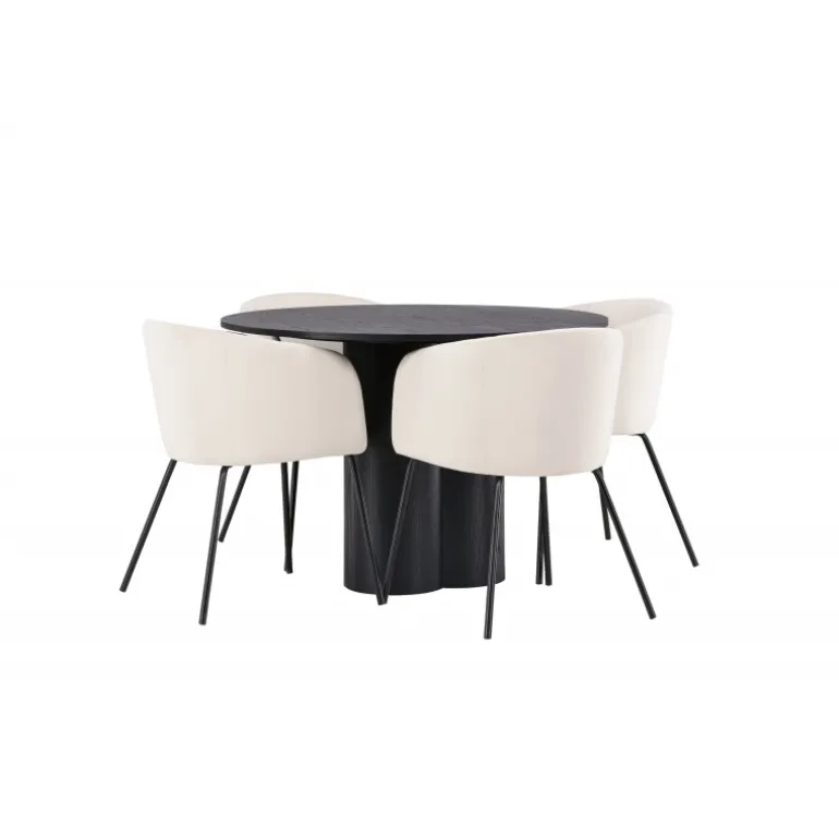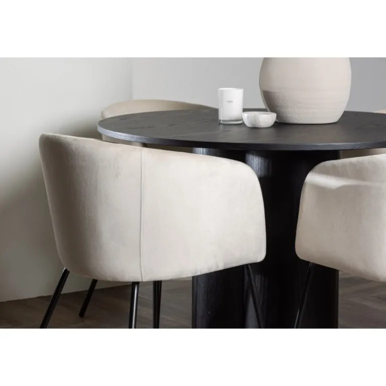 Stilfuld og smart Spisebordssæt med bløde former! Det runde spisebord Olivia imponerer med sit skandinaviske design og robuste konstruktion. Bordet har en konsekvent helhedsdesign i sort MDF med en tynd, rund bordplade og tre cylinderformede ben, der samles under midten af bordet. Her sammen med vores storslåede spisebordsstole Berit. Stolen har et fuldt polstret design med let afrundet ryg og sæde i velourstof og smalle ben i sort jern. Lige så moderne som den er behagelig! Bordets dimensioner: 110 cm.