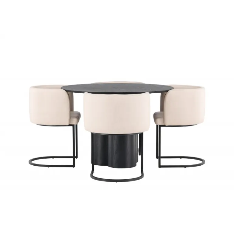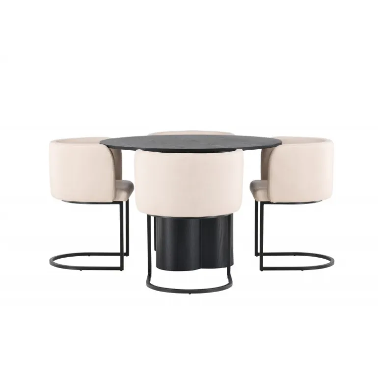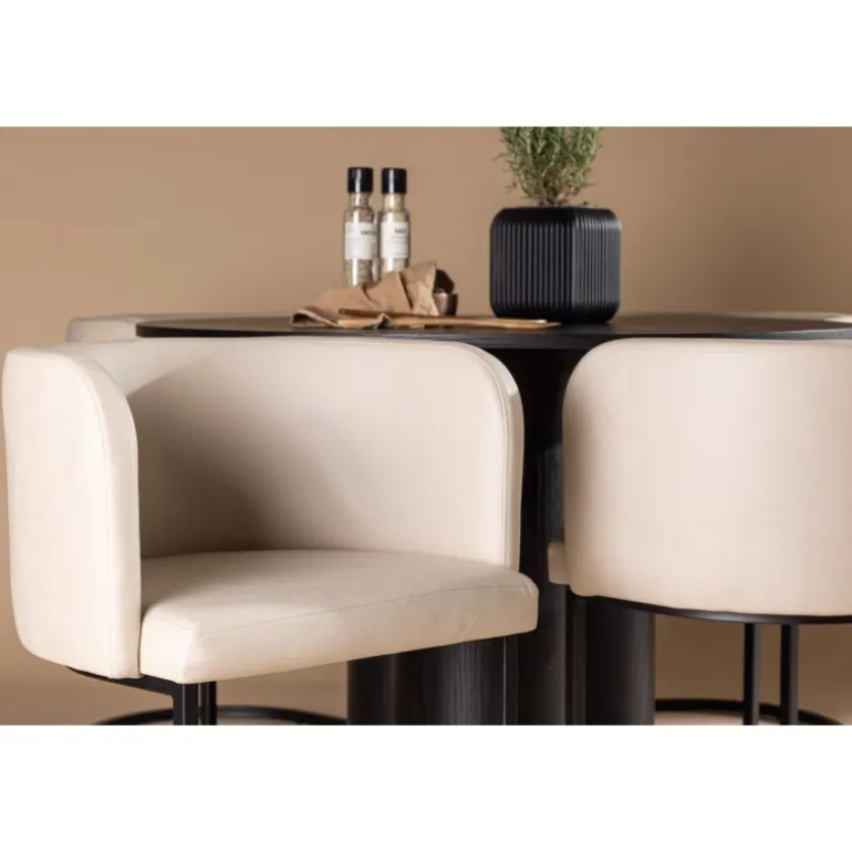 Indret luksuriøst og storslået! Det runde spisebord Olivia har et holistisk design i sort MDF med en tynd, rund bordplade og tre cylinderformede ben, der samles under bordets centrum. Farven har en let dækning på det finérbelagte bræt, hvilket gør materialets mønster synligt. Her sammen med vores elegante spisebordsstole fra Simrishamn-serien. Stolen har en fuldt polstret sæde med en afrundet ryglæn i beige TC-stof og dekorative, minimalistiske ben i sort stål. Sid komfortabelt og nyd samvær med dine kære! Bordets dimensioner: 110 cm.