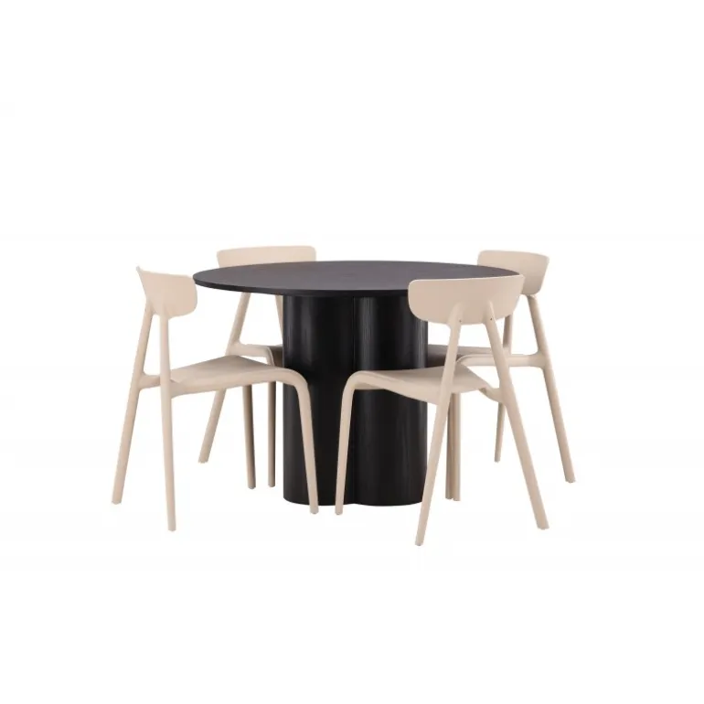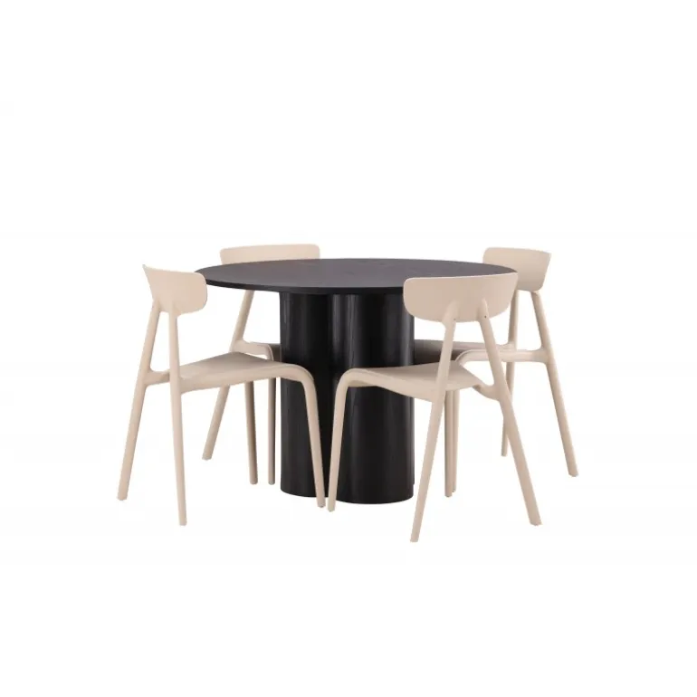 Nyd hyggelige måltider omkring vores populære Olivia spisebord. Bordet har et gennemført holistisk design i sort MDF med en tynd, rund bordplade og tre cylinderformede ben, der samles under midten af bordet. Farven har en let dækning på det finérbelagte bræt, hvilket gør materialets mønster synligt og giver møblet bevægelse. Her sammen med moderne spisebordsstole fra Ursholmen serien. Lavet af holdbar plast i en smuk beige farve, der er nem at matche med andre møbler. Undgå at gå på kompromis mellem stil og funktionalitet!