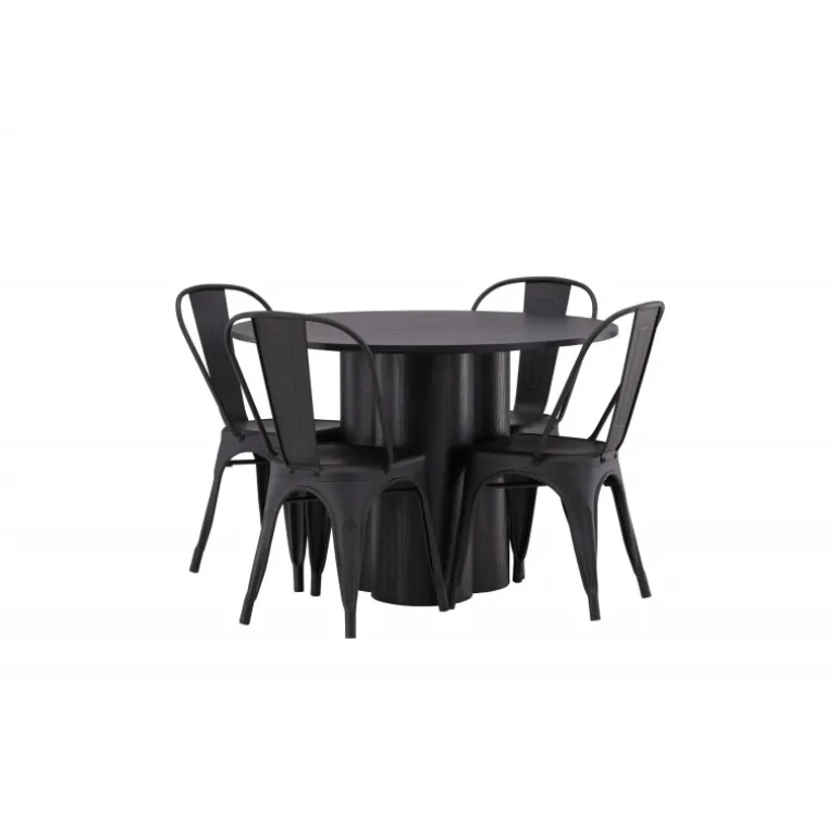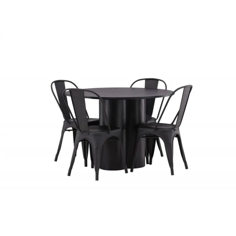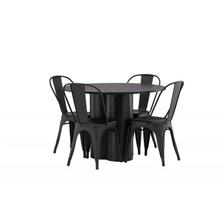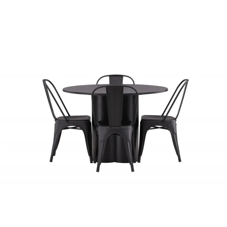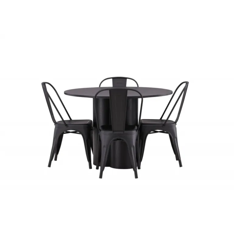 Indret stuen minimalistisk og moderne! Spisebordet Olivia imponerer med sit skandinaviske design og smagfulde udseende. Bordet har et helhedsorienteret design i sort MDF med en tynd, rund top og tre cylinderformede ben, der er samlet under midten af bordet. Her sammen med stole fra Tempe-serien i klassisk design. Stolene har let udskårne ben, der smidigt møder sæde og ryglæn i et stilfuldt design, konsekvent lavet af sort metal. Nyd hyggelige måltider i fremtiden!