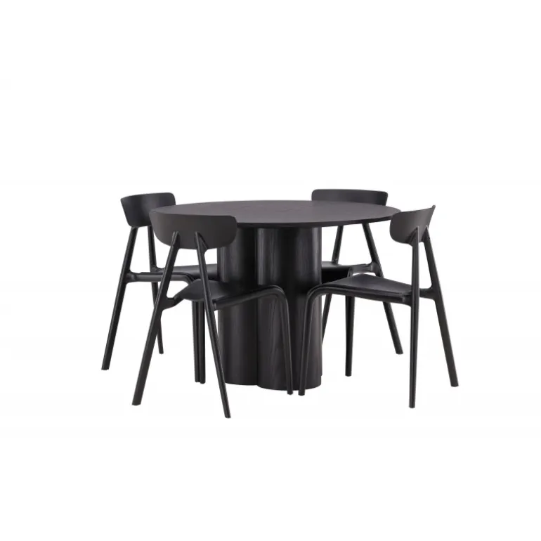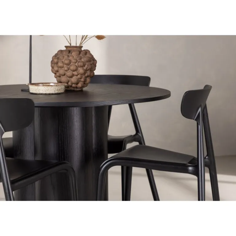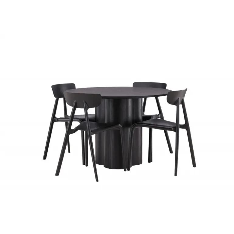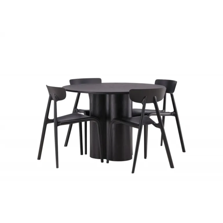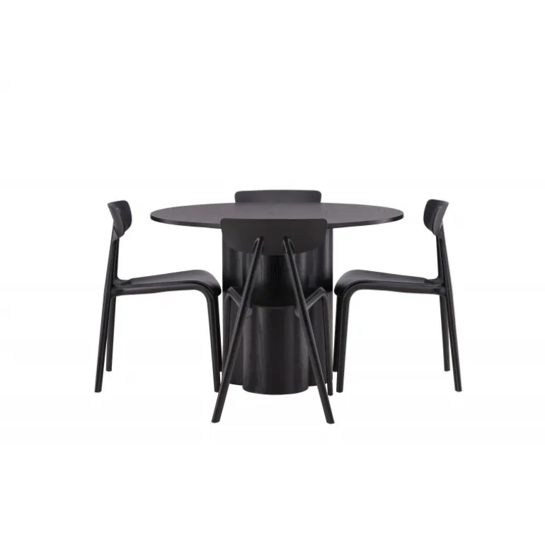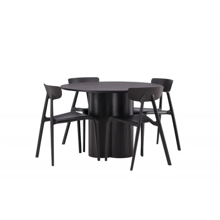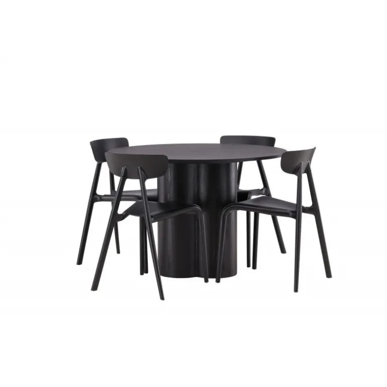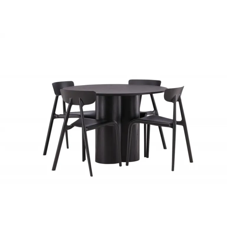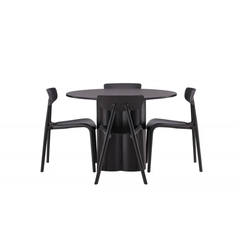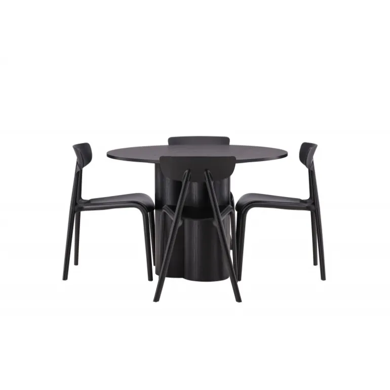 Skab en hyggelig atmosfære i din stue med en moderne spisestuegruppe! Spisebordet Olivia imponerer med sit skandinaviske design og smagfulde udseende. Bordet er designet i en sodsort farve. Den runde bordplade er lavet af MDF, og stellet består af tre cylinderformede ben, der samles under midten af bordet. Dette sæt inkluderer også dejlige spisebordsstole fra Ursholmen-serien. De er fremstillet af holdbar plastik i en slank sort farve, der er let at matche med andre møbler. Stolen har en minimalistisk ryg, en lidt dybere sæde og let flarede ben i et skandinavisk design. Undgå at gå på kompromis mellem stil og funktionalitet!