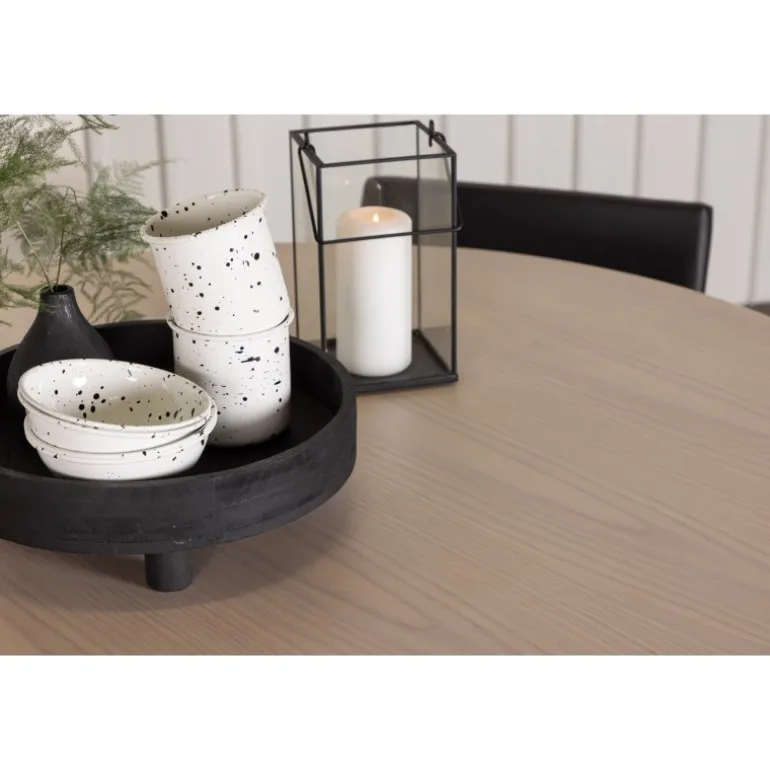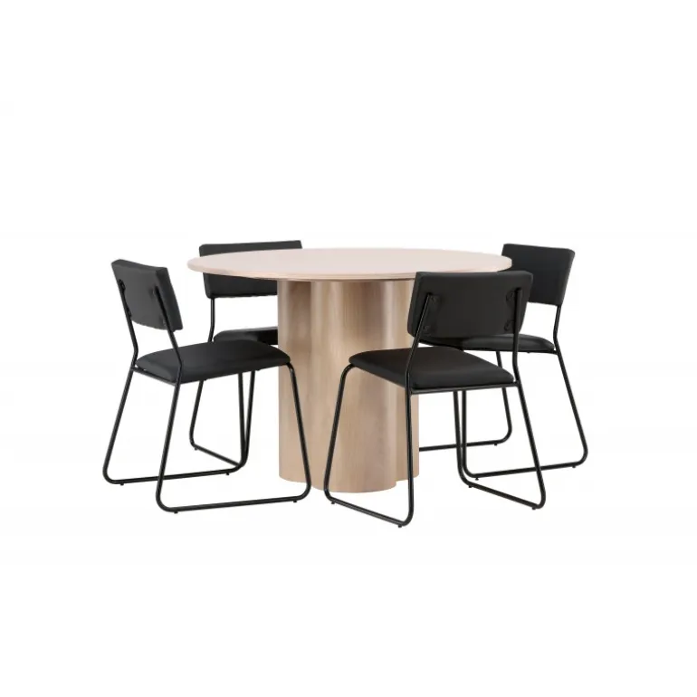 Den perfekte kombination af minimalisme og robust design! Spisebordet fra Olivia-serien har et konsekvent overordnet design i hvidt pudset MDF med en tynd, rund topplade og tre cylindriske ben, der er samlet under midten af bordet. Farven har en let dækning på den finérbelagte skive, hvilket gør materialet synligt og giver liv og bevægelse til bordet. Her sammen med 4 moderne spisebordsstole fra Kenth-serien. Stolen har ryglæn og sæde i sort polyurethanmembran og polyester samt dekorativt smalle stoleben i jern. Skab et luksuriøst midtpunkt i hjertet af hjemmet!