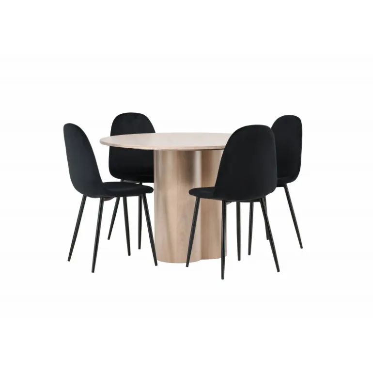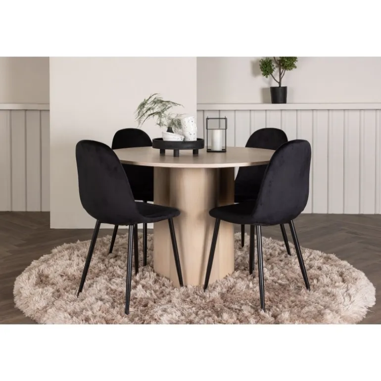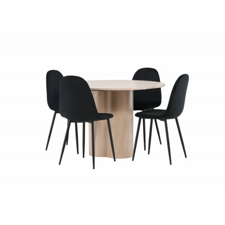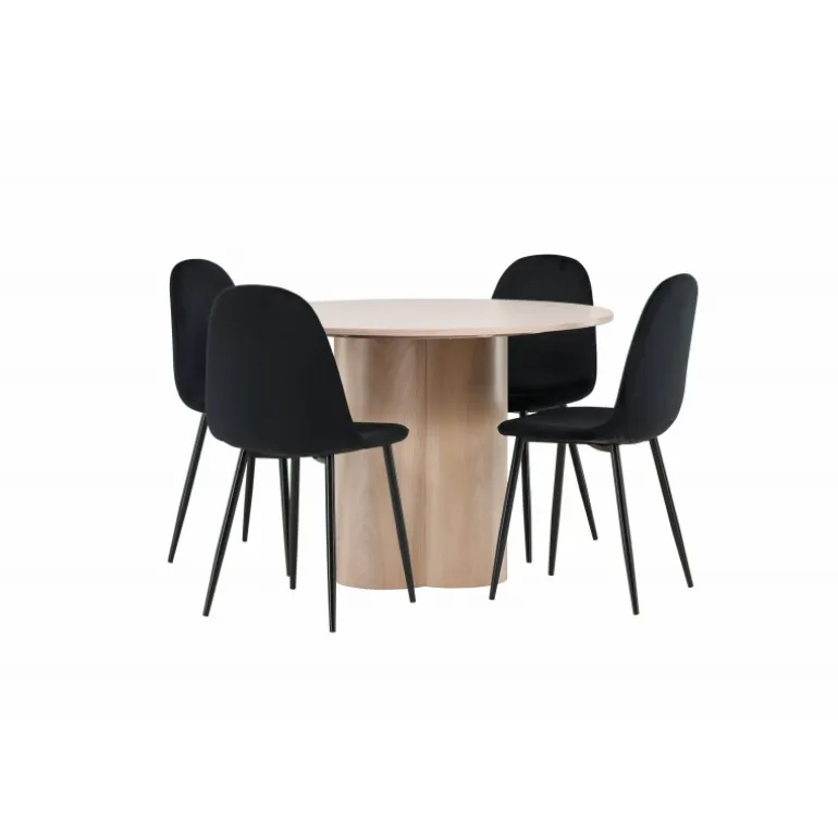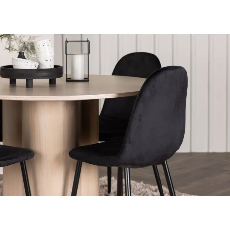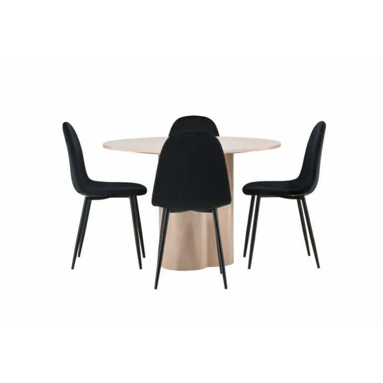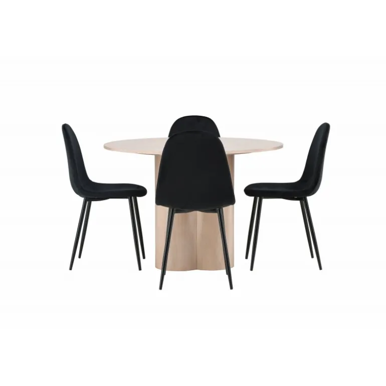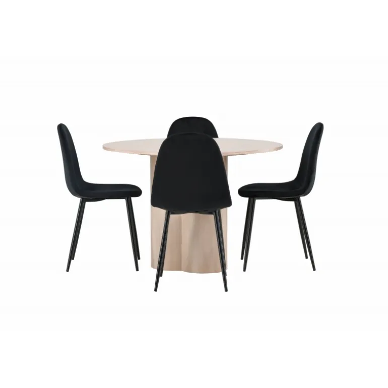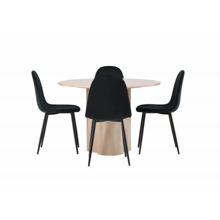 Inviter dine kære til hyggelige stunder med Olivia Rund Spisebordssæt! Dette stilfulde spisebord har et elegant skandinavisk design og en robust konstruktion. Bordet er lavet af hvidmalet MDF med en tynd, rund bordplade og tre cylindriske ben, der samles under midten af bordet. Sættet inkluderer også 4 spisebordsstole fra Polar-serien. Stolene er betrukket med sort fløjl og har ben i sort pulverlakeret metal. Skab et elegant blikfang i hjemmets hjerte – her sidder ingen på kanten!