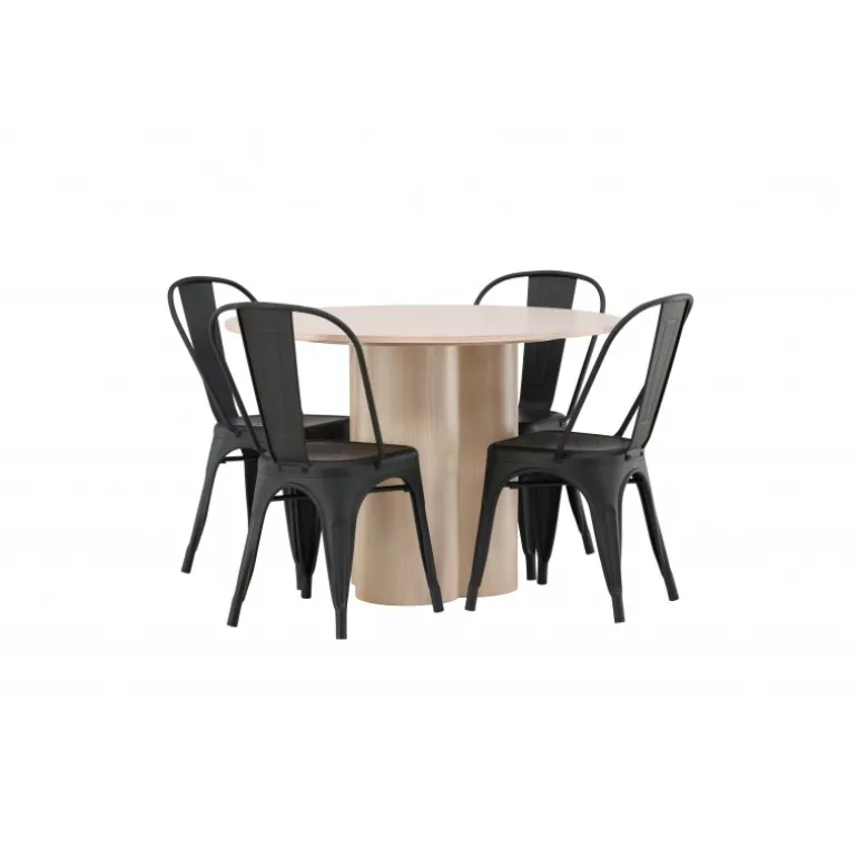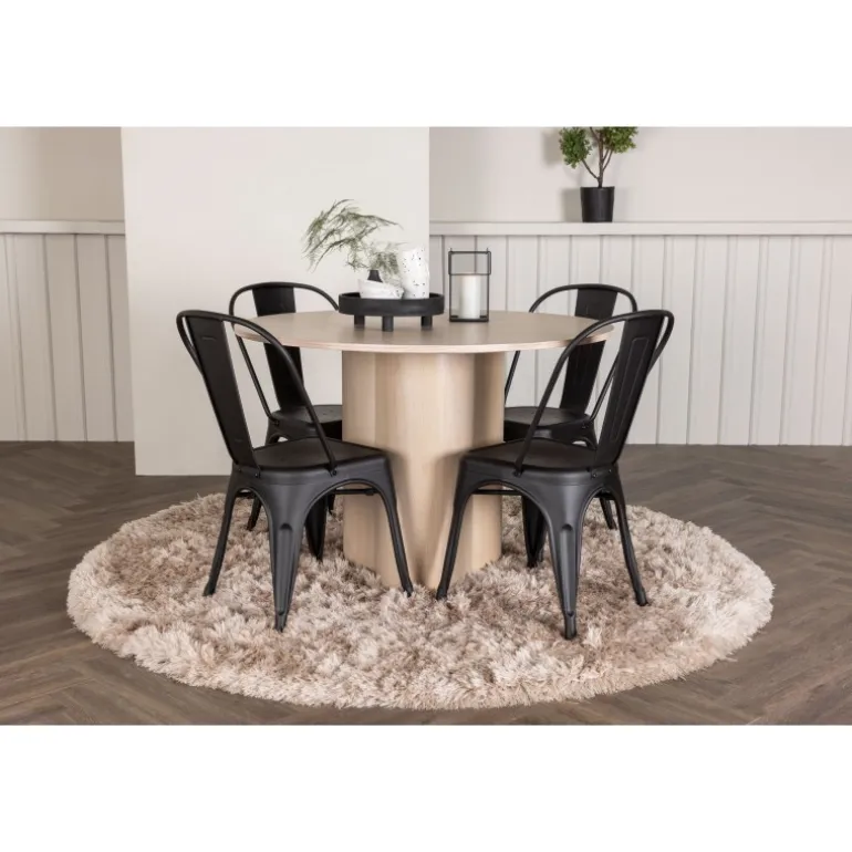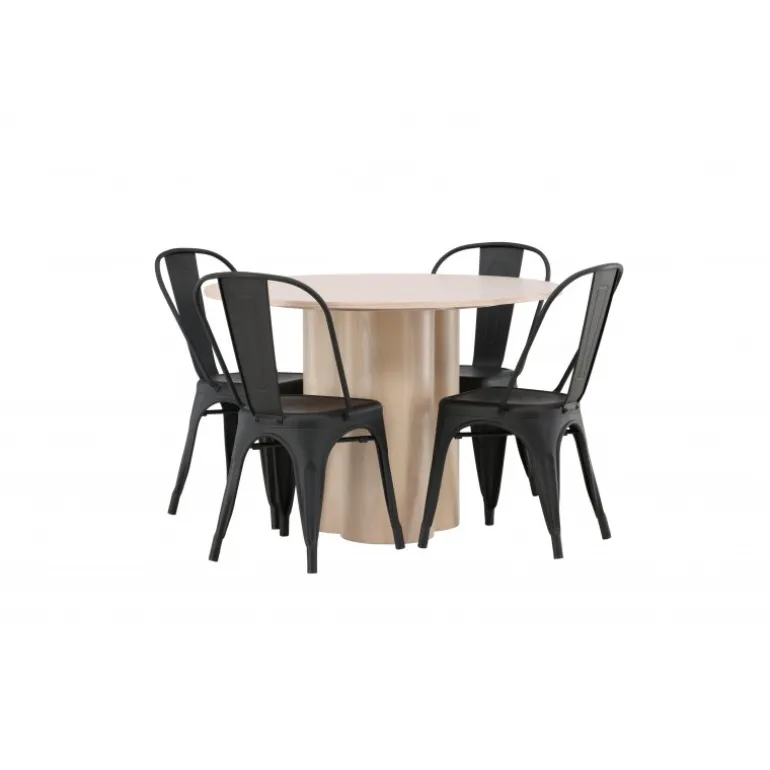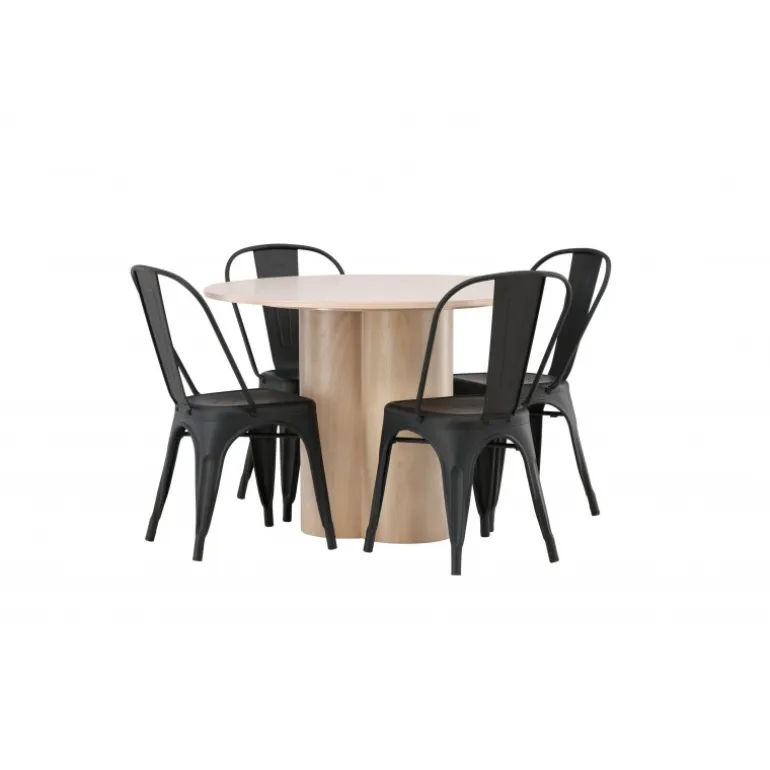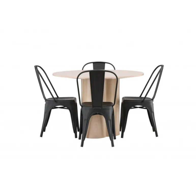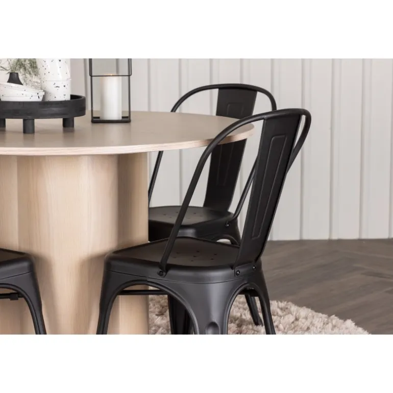 En pompøs Spisebordssæt der passer perfekt ind i det moderne hjem! Spisebordet Olivia har et smagfuldt skandinavisk design og en robust konstruktion. Bordet har et ensartet design i hvidpudset MDF med en tynd, rund bordplade og tre cylindriske ben, der er samlet under midten af bordet. Her sammen med 4 spisebordsstole fra Tempe-serien. Stolen har let udadgående ben, der møder sædet og ryglænet i et stilfuldt design, konsekvent lavet af sort metal. Inviter til mange sociale stunder fremover – ingen ender her!