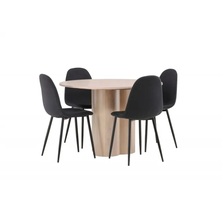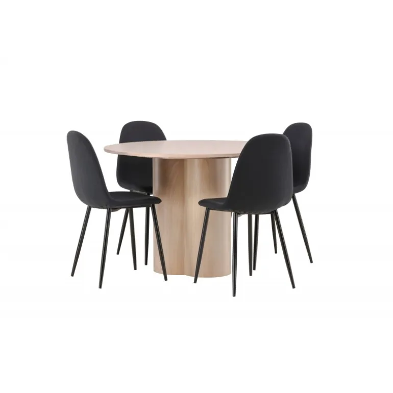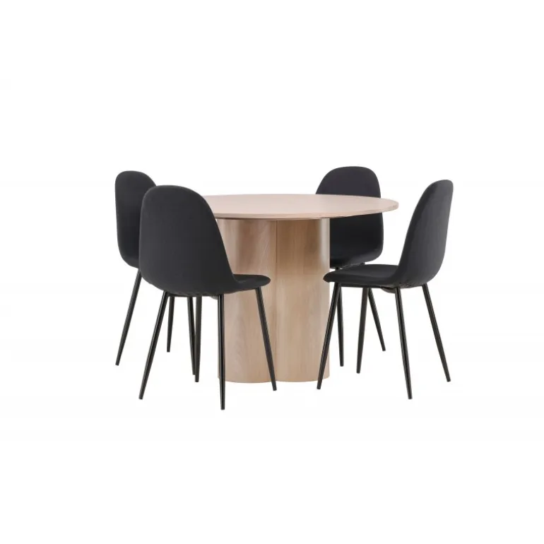 En stilfuld Spisebordssæt, der inviterer til sociale øjeblikke med dine kære! Spisebordet Olivia har et smagfuldt skandinavisk design og en robust konstruktion. Bordet har et ensartet design i hvidmalet MDF med en tynd, rund topplade og tre cylindriske ben, der er samlet under midten af bordet. Her sammen med 4 spisebordsstole fra Polar-serien. Stolens ryg er fuldt beklædt i polstret sort polyesterstof, og benene er i sort pulverlakeret metal. Skab et stilfuldt blikfang i hjemmets hjerte – ingen ender på kanten her!
