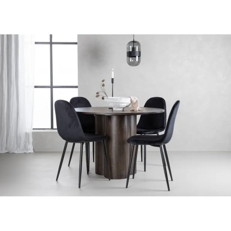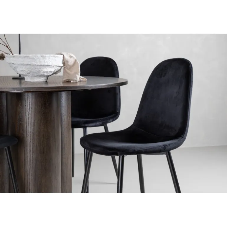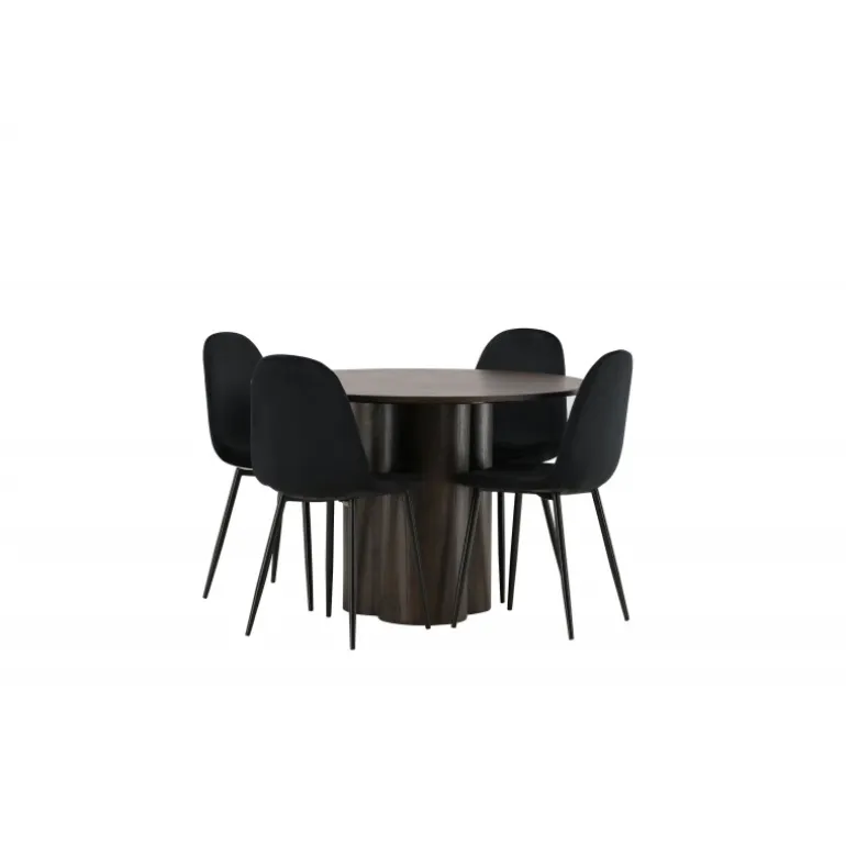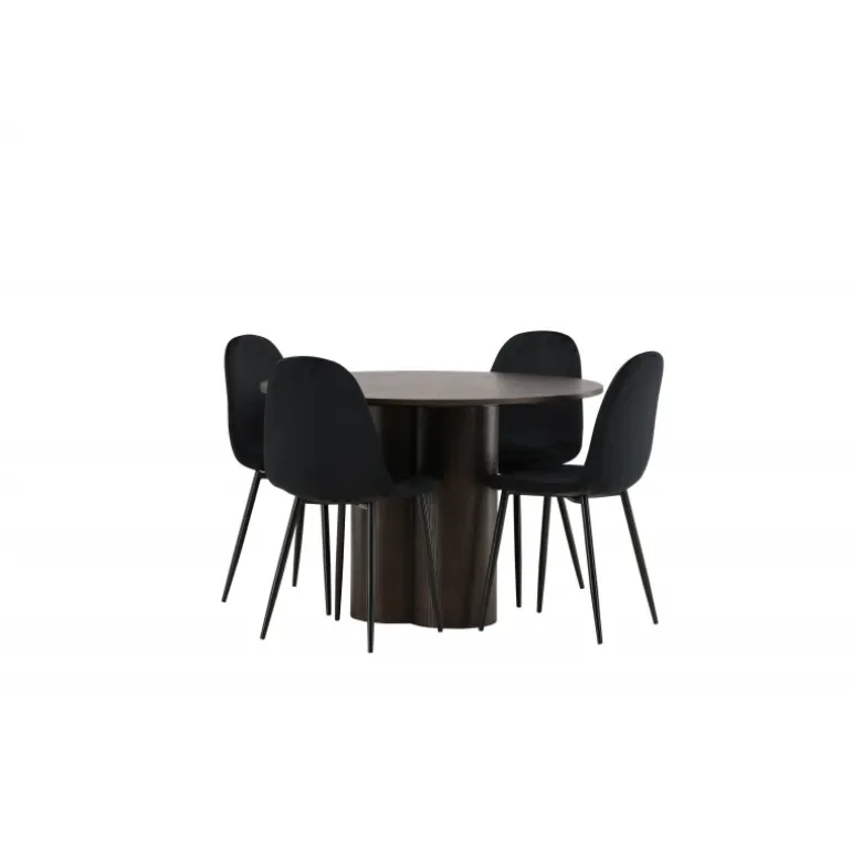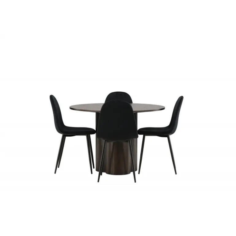 Undgå at gå på kompromis mellem stil og komfort! Spisebordet Olivia imponerer med sit skandinaviske og smagfulde design. Bordet kommer i en elegant mocca farve i MDF med en tynd, rund top og tre cylinderformede ben, der er samlet under midten af bordet. Her i perfekt kombination med stole fra Polar-serien. Stolen har et fuldt polstret design med en afrundet ryg og sæde i sort velourstof med blød polstring og ben i sort pulverlakeret metal. Nyd behagelige måltider med denne stilfulde og komfortable Spisebordssæte!