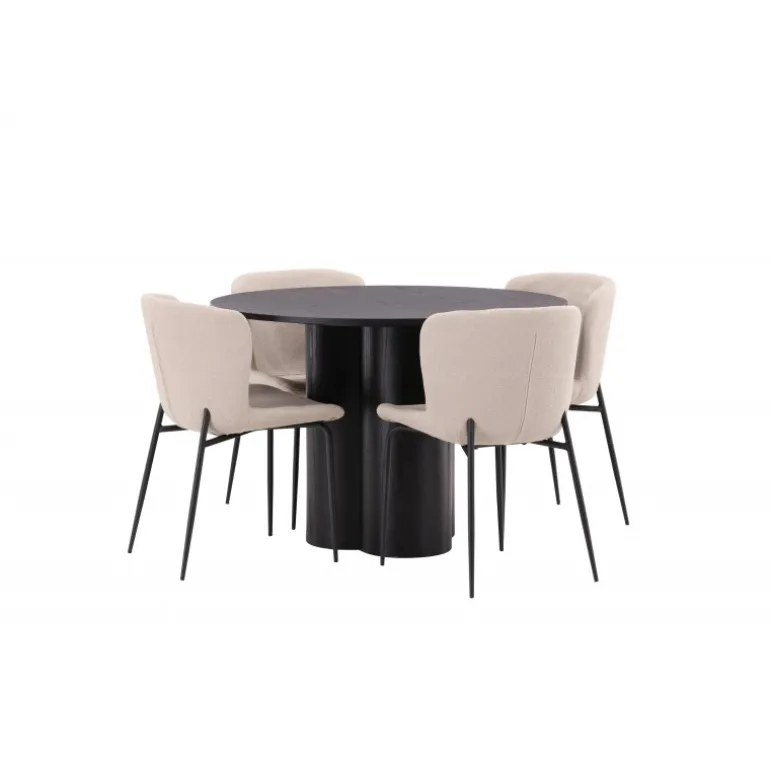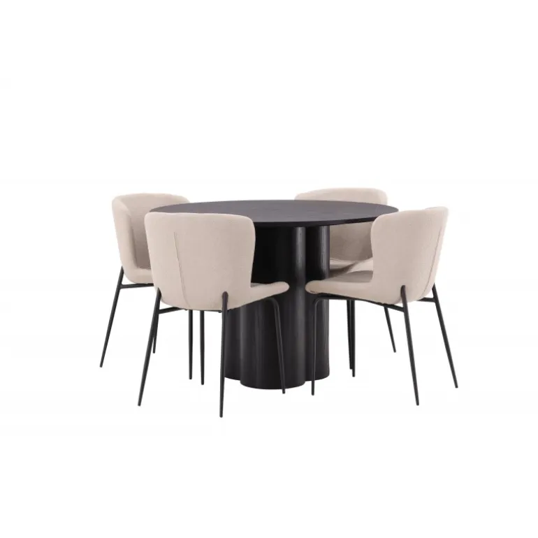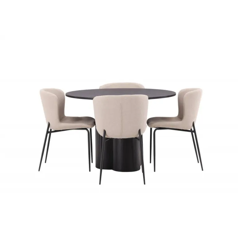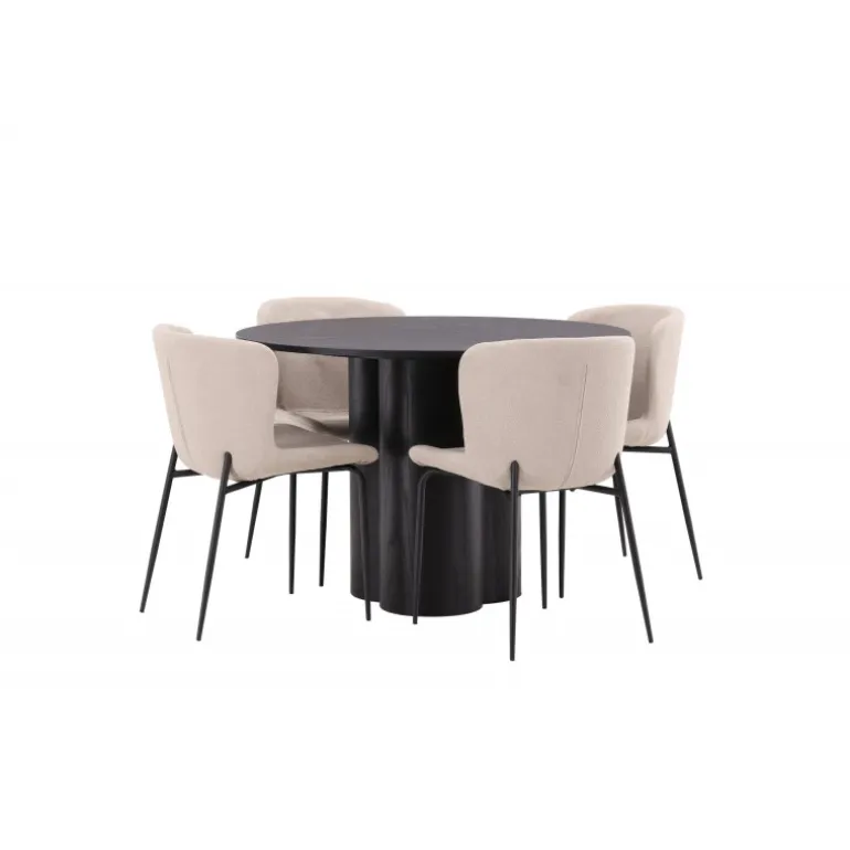 Skab en indbydende atmosfære i dit hjems hjerte med denne stilfulde Spisebordssæt! Stolene er fra Modesto-serien og har en polstring i beige, fluffy bouclé-stof og minimalistiske ben i sort metal. Den let afrundede ryg og den polstrede sædepude giver ekstra komfort. Her i en fantastisk kombination med spisebordet Olivia. Bordet har et holistisk design i sort MDF med en tynd, rund top og tre cylinderformede ben, der er samlet under midten af bordet. Farven har en let dække på den finerede plade, hvilket gør materialets mønster synligt. Det skal føles godt at sætte sig ned til et dejligt måltid!