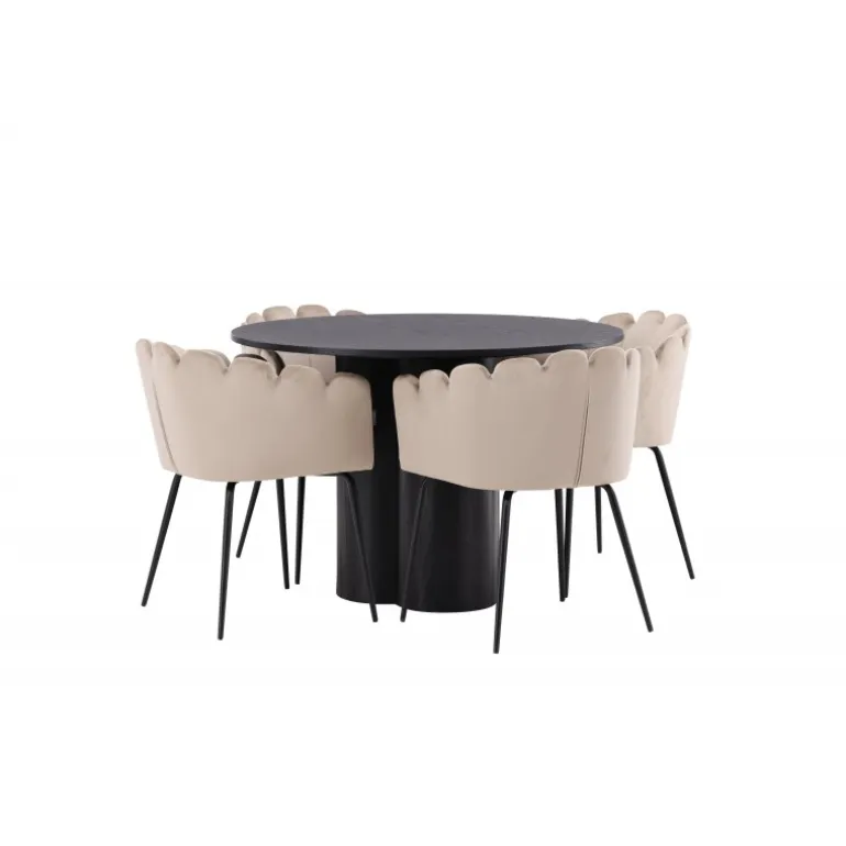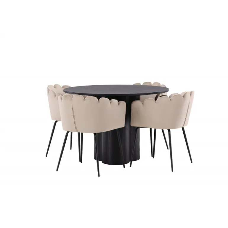 Sid komfortabelt og inviter til sociale måltider i fremtiden – her ender ingen på kanten. Spisebordet Olivia imponerer med sit skandinaviske og smagfulde design. Bordet har et samlet holistisk design i en populær mocca farve. Den runde top er i MDF, og rammen består af tre cylinderformede ben, der samles under midten af bordet. Her i perfekt match med vores luksuriøse stole fra Limhamn-serien. Stolen har et indbydende design med dekorativt muslingformet ryg med dekorative syninger og et rundt sæde i dejligt beige velourstof. Benene er i sort pulverlakeret metal. En perfekt Spisebordssæt i et moderne look!