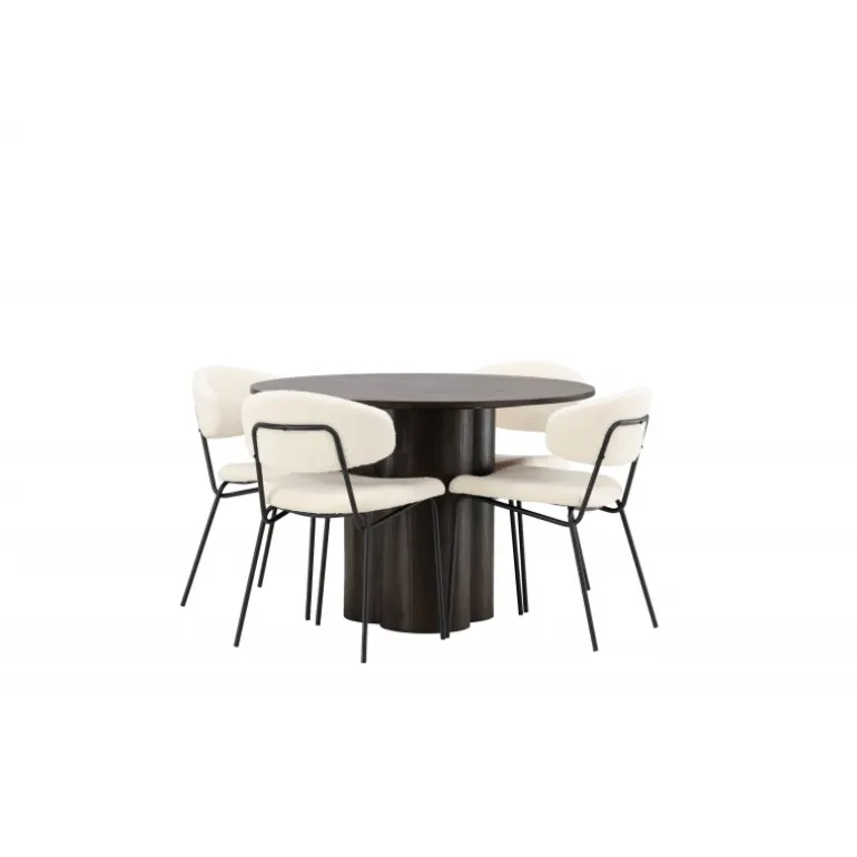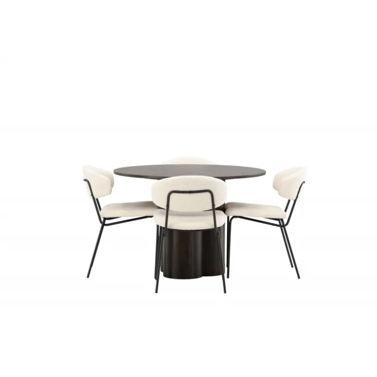 - Materialer af høj kvalitet: Bord i MDF og finer, stole i hvid boucléstof og sort stålramme.