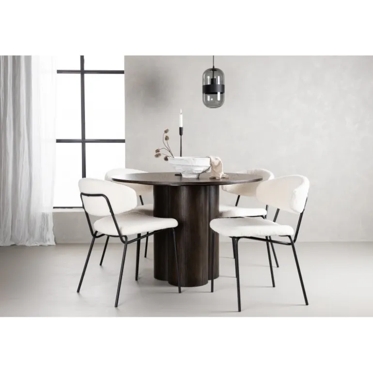 En perfekt match – denne madgruppe imponerer! Spisebordet Olivia imponerer med sit skandinaviske design og smagfulde udseende. Bordet kommer i en smagfuld mocca farve i MDF med en tynd, rund top og tre cylinderformede ben, der er samlet under midten af bordet. Her sammen med vores trendy spisebordsstole fra Chico-serien. Stolene har et minimalistisk og komfortabelt design med en ryg og sæde i hvid boucléstof og en smal ramme i sort stål. Her får du en hyggelig blikfang i dit hjem!