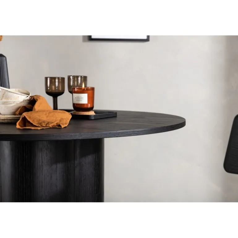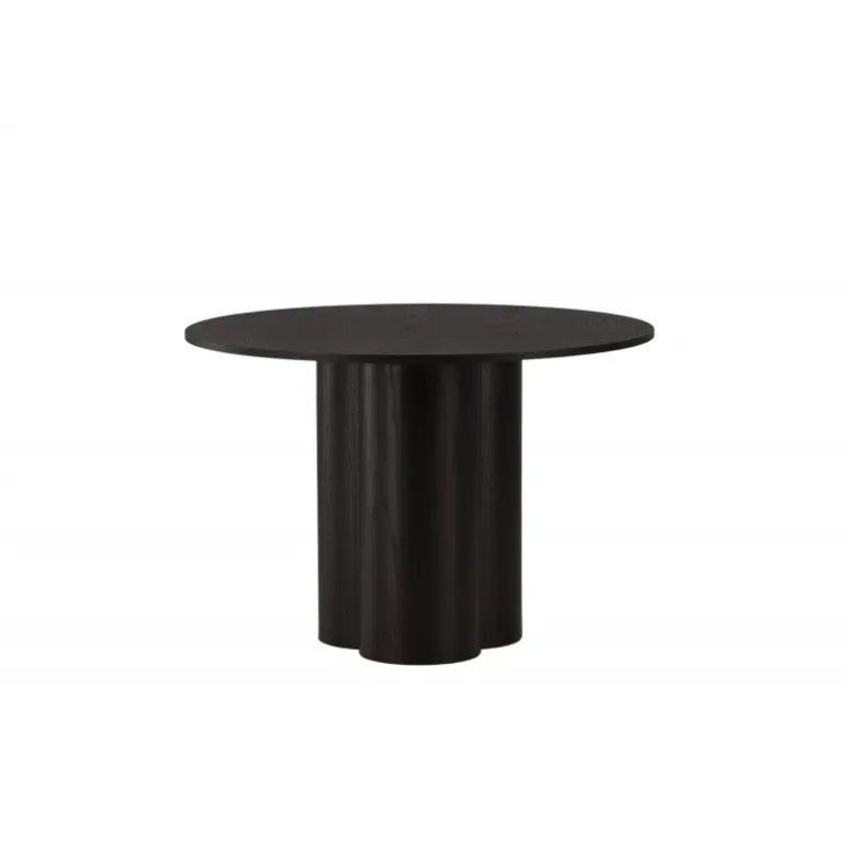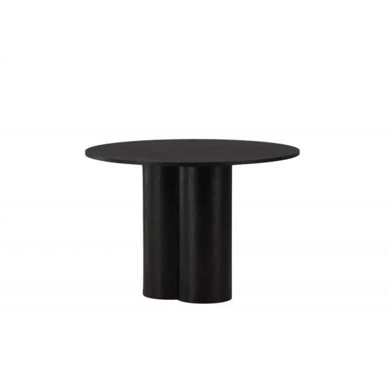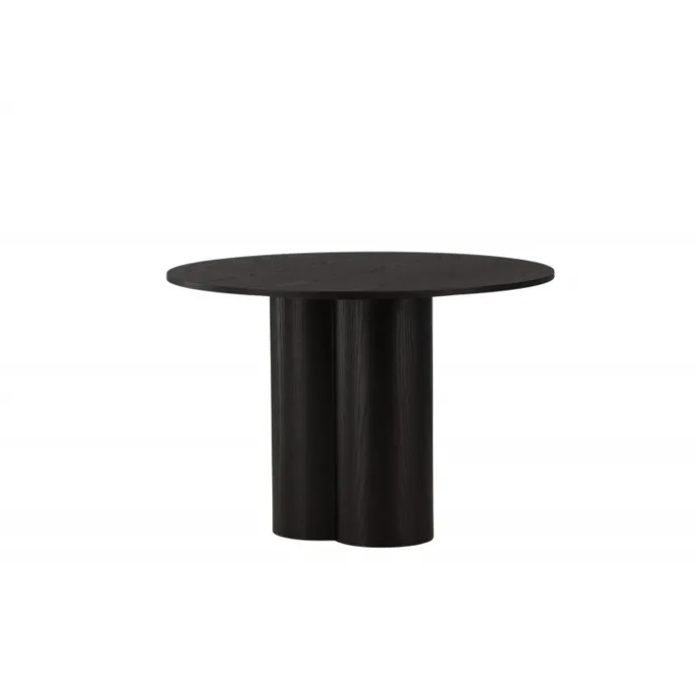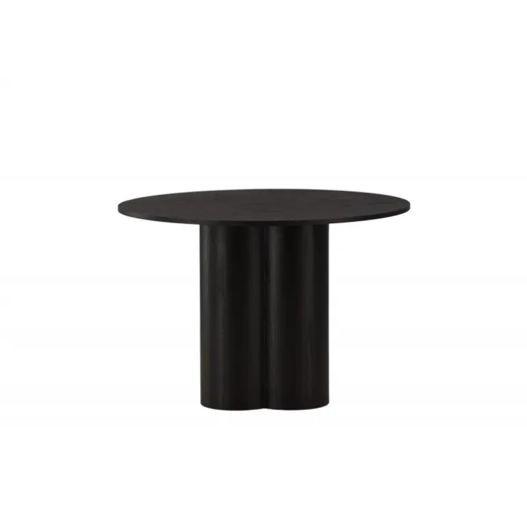 Olivia Spisebord imponerer med sit skandinaviske design og smagfulde udtryk! Rundt spisebordet har et ensartet design i sort MDF med en tynd, rund bordplade og tre cylindriske ben, der samles under midten af bordet. Farven har en let dækning på den finerede plade, hvilket gør materialet synligt og giver liv og bevægelse til møblet. Skab en stilfuld blikfanger i hjemmets hjerte – her ender ingen på kanten!