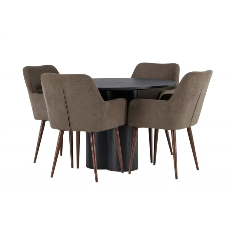 Skab stil og komfort i dit hjem med dette indbydende Spisebordssæt – en perfekt kombination af design og komfort! Vores runde spisebord Olivia er fremstillet med omhu og eksklusivitet for øje. Den konsekvente sorte farve tilføjer et sofistikeret touch til rummet, mens den tynde, runde topflade lavet af bæredygtigt MDF-materiale giver et moderne udtryk. Bordets tre cylinderformede ben, pænt samlet under midten af bordet, tilbyder en stabil og robust base. Bordets dimensioner: 110 cm. Sammen med spisebordet leveres vores brune spisebordsstole fra Tomorrow-serien. Du vil elske at sidde i disse komfortable stole og nyde lange, hyggelige måltider. Stolens brune polyesterstofsæde med integrerede armlæn tilbyder dejlig komfort, mens stoles ben i en moderne valnøddebrun farve giver en stilfuld kontrast til bordets elegante design. Dette moderne Spisebordssæt er det bedste valg for dem, der søger en elegant og funktionel indretning til deres hjem. Med sin skandinaviske design og smagfulde sammensætning vil dette spisebord og dets matchende stole bringe en tidløs charme til din stue eller køkken.