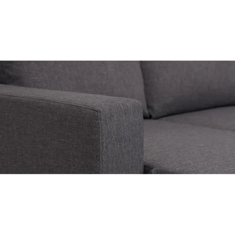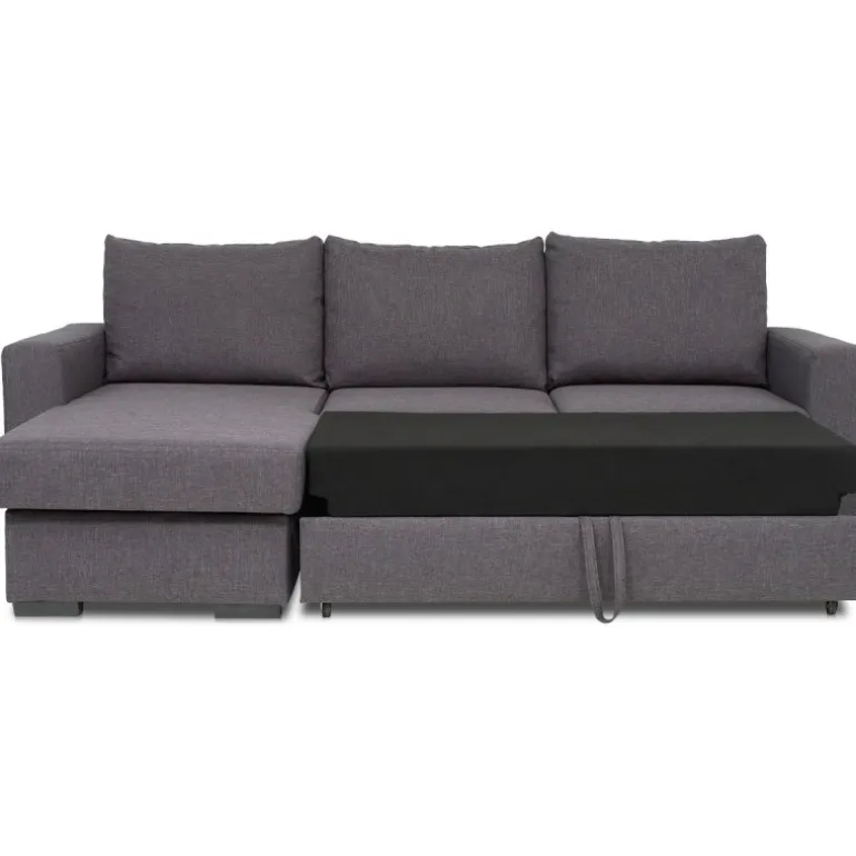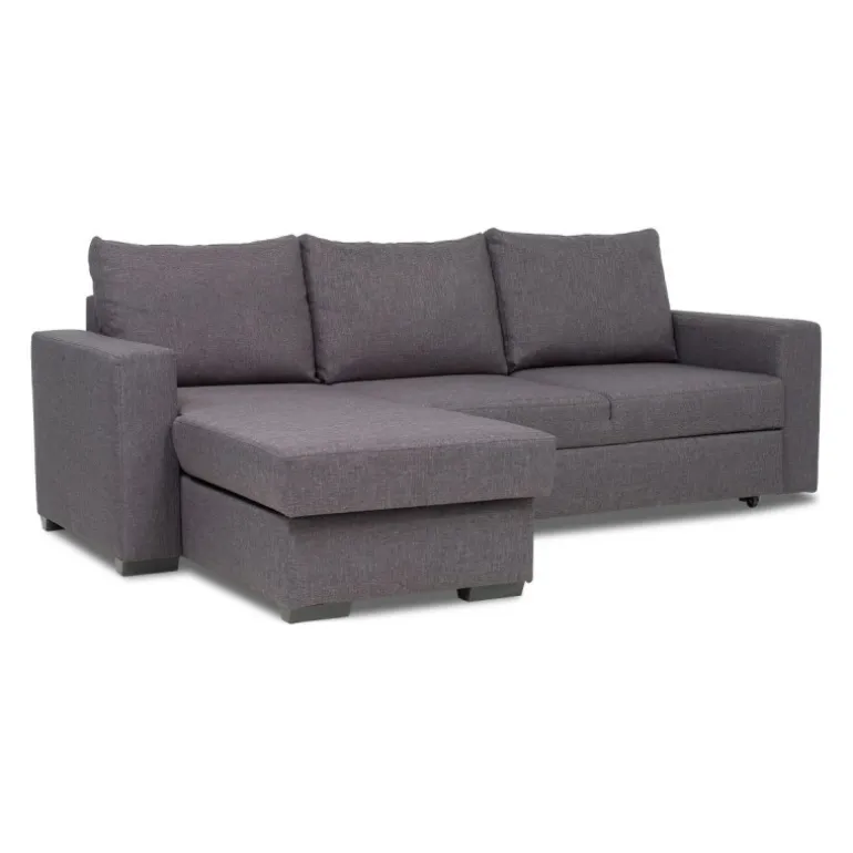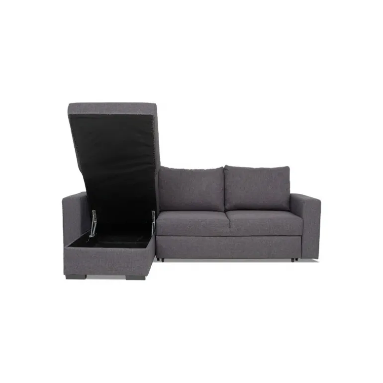 Olivia sovesofa i slidstærkt og praktisk gråt strukturvævet stof, en populær lille sovesofa med vendbar chaiselong, som tåler daglig brug og er utrolig nem at slå ud. Sofaen har magasin i chaiselongen til praktisk opbevaring af sengetøj. Olivia sovesofaen er vendbar så man også senere kan få sofaen til at passe ind i boligindretningen. Olivia er polstret med koldskum i sædet hvilket giver en medium/fast ligge- og siddekomfort. Udtræksdelen er polstret med sort møbelstof.