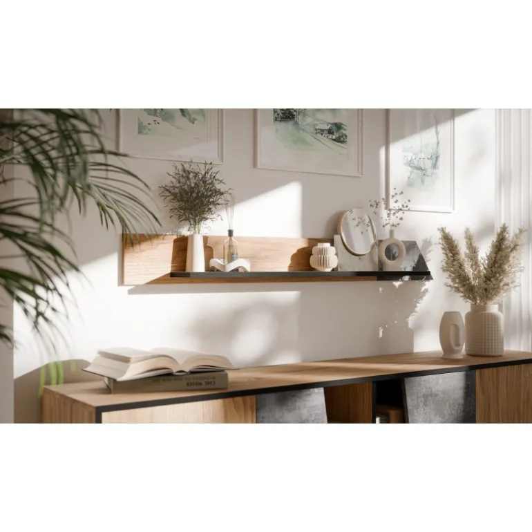 Tilføj et strejf af moderne elegance til dit hjem med OVO Hylde i Mørk Beton og Uregelet Eg. Denne hylde er perfekt til opbevaring og udstilling af dine yndlingsting. Fremstillet af lamineret mat spånplade på 16mm, kombinerer den holdbarhed og stil. Med dimensionerne højde: 15 cm, bredde: 130 cm, dybde: 20 cm tilbyder denne hylde rigelig plads uden at optage for meget vægplads.