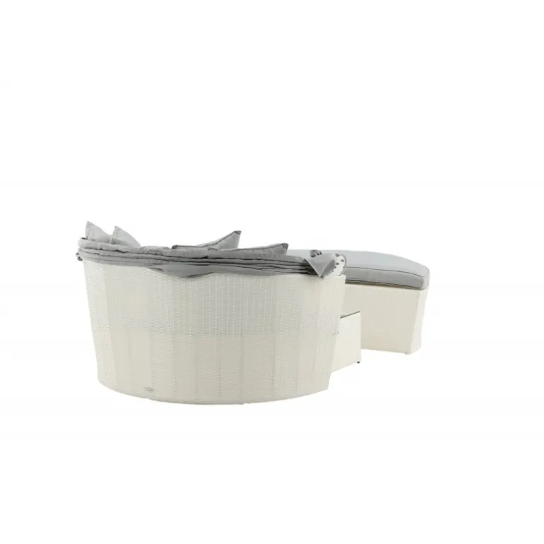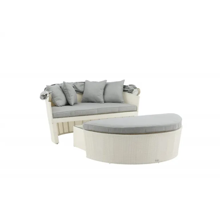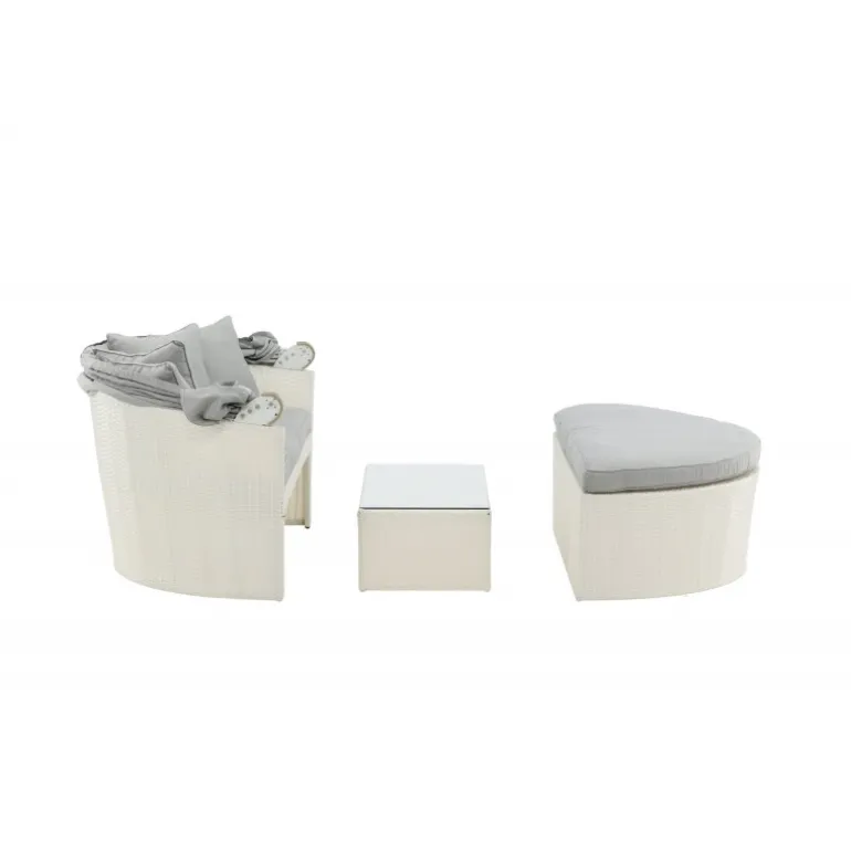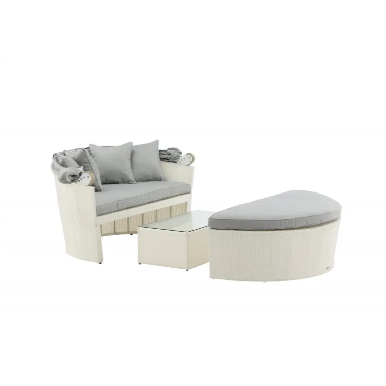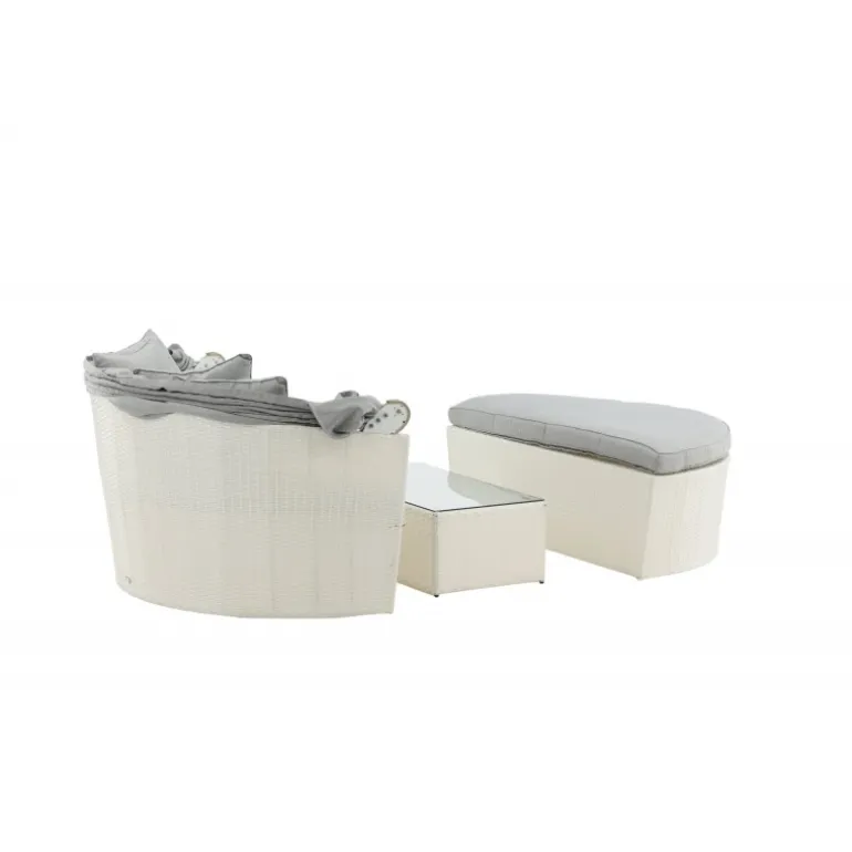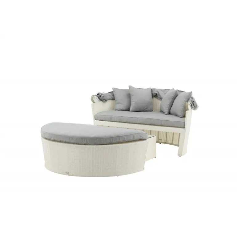 - Hvid kunstig rattan: Holdbart og vejrbestandigt materiale.